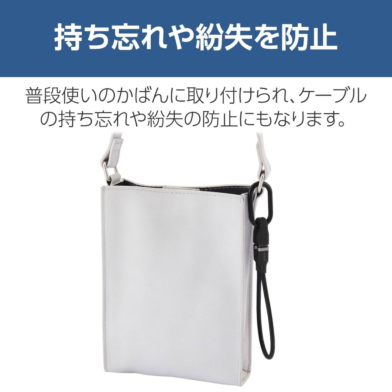 普段使いのかばんに取り付けられ、ケーブルの持ち忘れや紛失の防止にもなります。