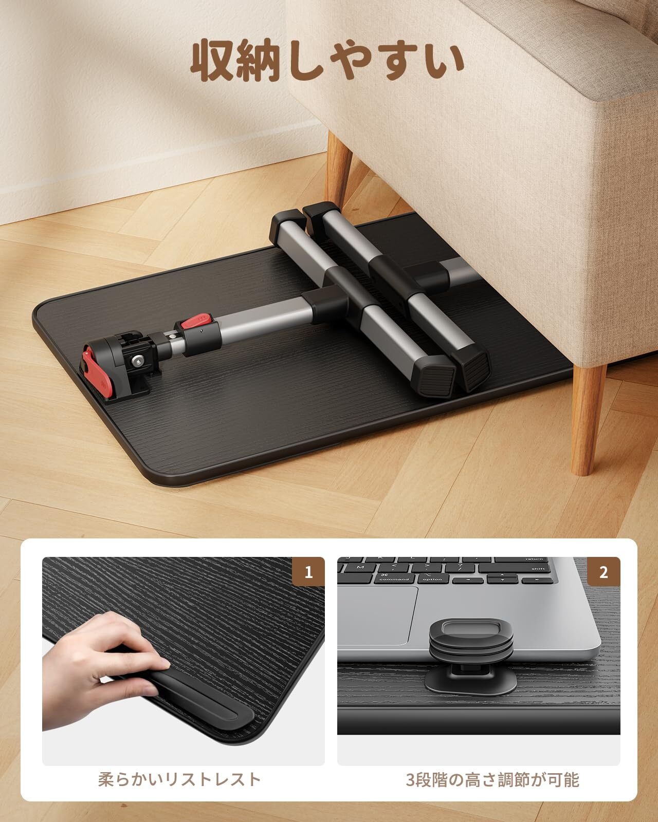 角度·高さを調節できるテーブル:高さ:5段階調整:24~32cm、角度は4段階:0~36°調整できる;天板の下広い空間がある両脚が自由に動けます。休日にノートpcで映画を見ながらベッドで過ごす時間を快適に。