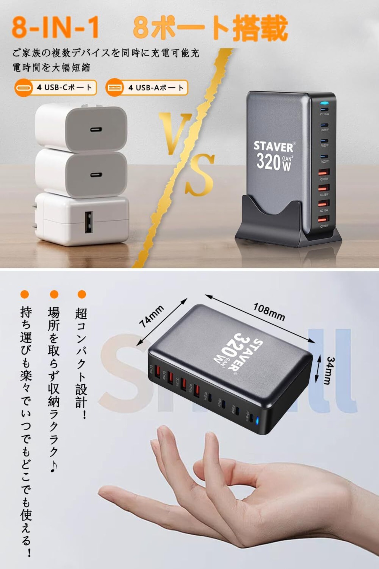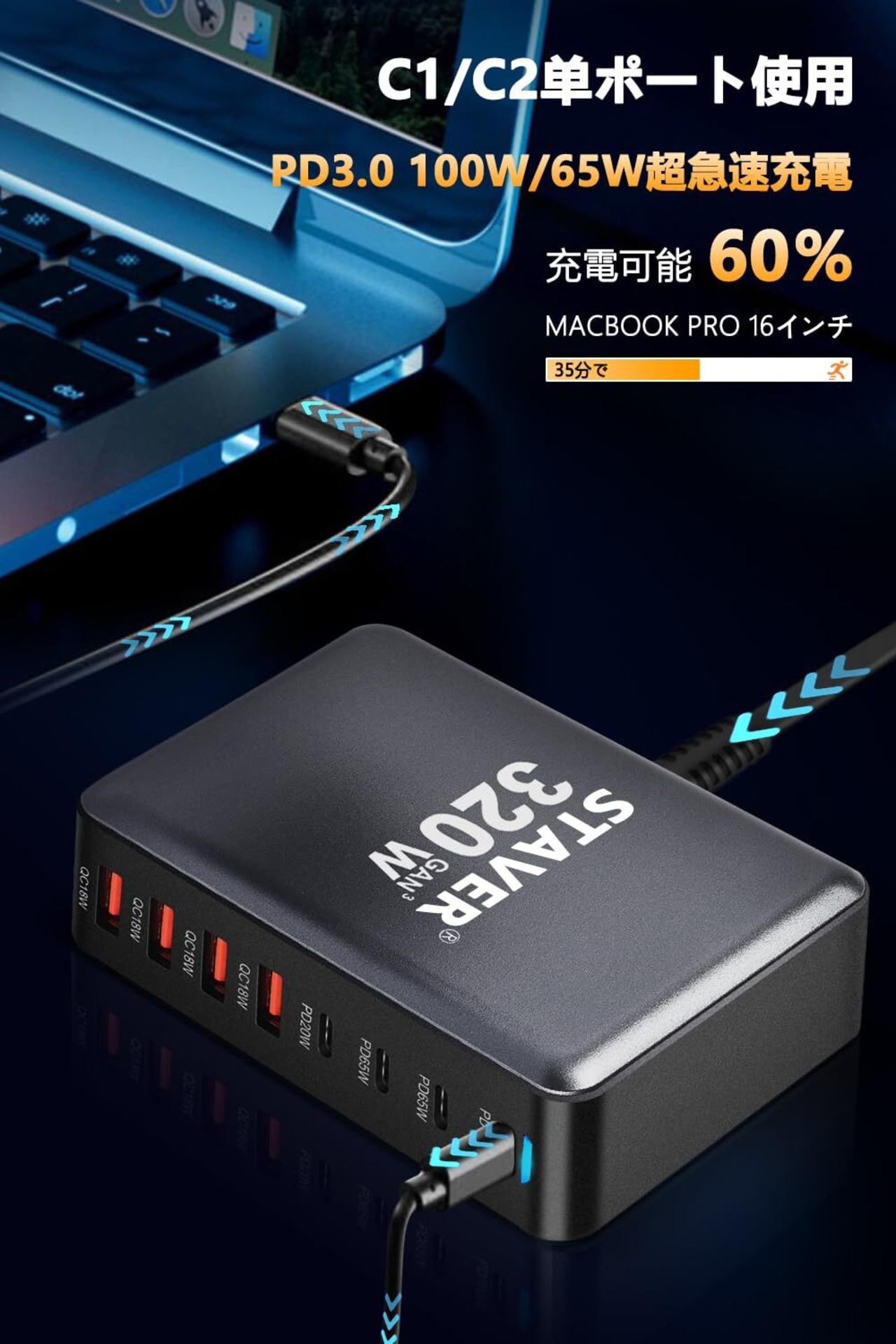 【近未来的でスマートな縦型デザイン・省スペース】出力が上がるほど充電器は大きくなりがちですが、この320W充電器は革新的な縦型デザイン(サイズ:約9.5x8.5x7.3cm)により、省スペースで便利に使用できます。指紋が残りにくい高品質でエレガントなフォームファクターにより、使っていると楽しい気分になります。1.5mの長さの電源ケーブル付きで、デスクの上や枕元に置いてスマートに使用できます。まさに近未来のデジタルライフスタイルに欠かせない逸品です。