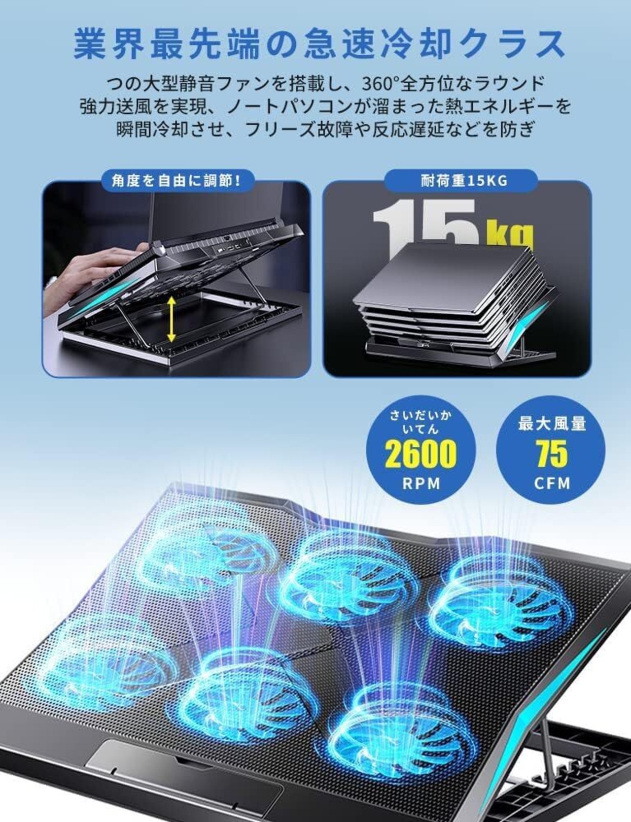 ノートパソコン冷却パッド 冷却台 冷却ファン【6機搭載】 6段階高度調整 風量調節 ノートPCクーラー 大風量 低騒音 メタルメッシュデザイン 滑り止め付き ledストリップライト付 9-17インチノートPC対応 / Macbook/Macbook Pro / PS3 / PS4等に対応 オフィス/在宅勤務/出張などに適用
