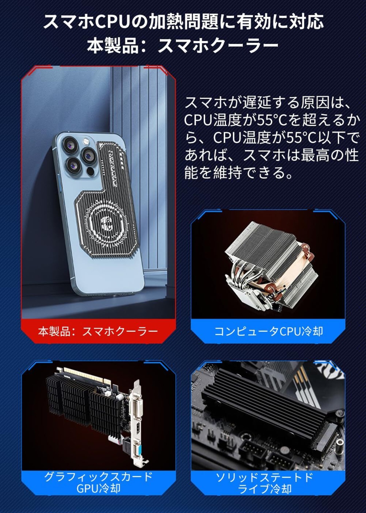 【熱を解決する】スマホ のカートンの 原因 はCPUの 温度 が55℃を超えるためで, 温度 が55℃を 下回る と スマホはピーク 性能を維持することができる。本製品を使用すると、スマホのCPUの 温度を36℃以内に抑えることができる。