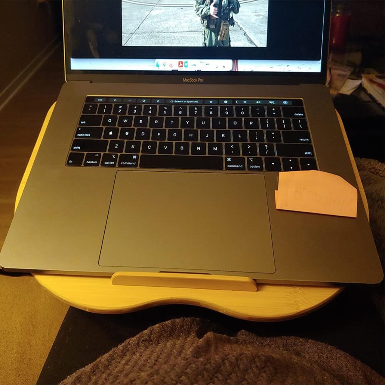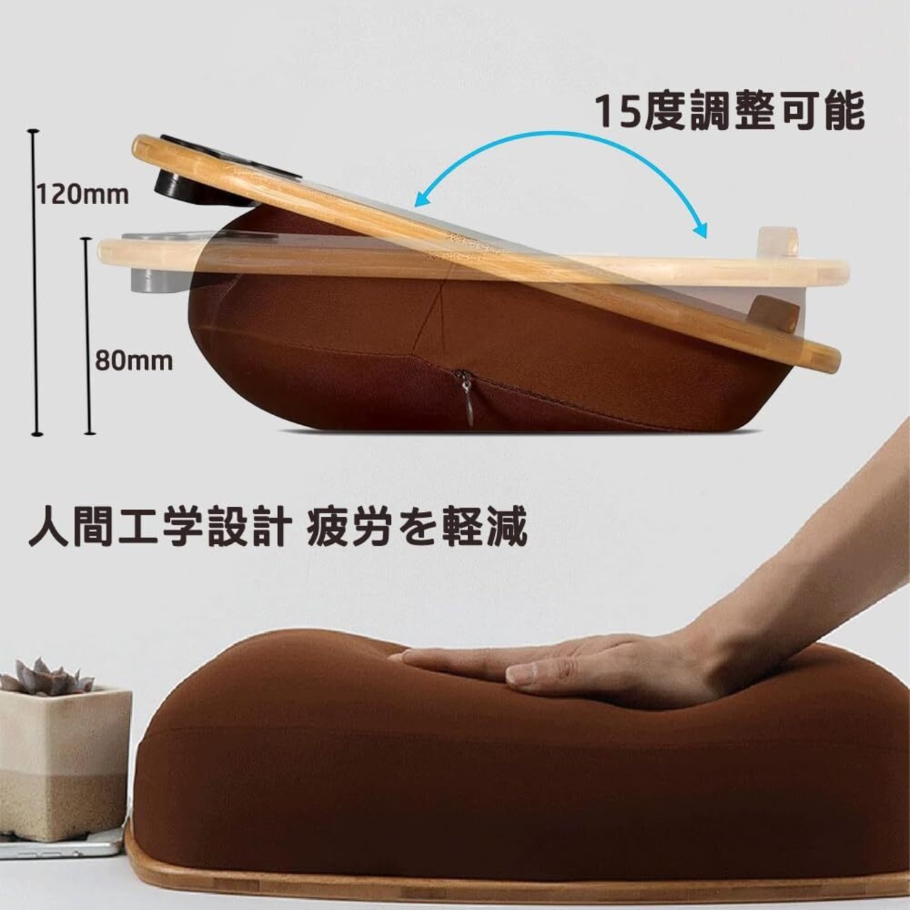 人間工学デザイン、体に負担がかからない、お体の姿勢に合わせることができることで、お腿の上に簡易なデスクになり、ベッド、ソファ、車内などの場所で快適な作業環境が作れます。