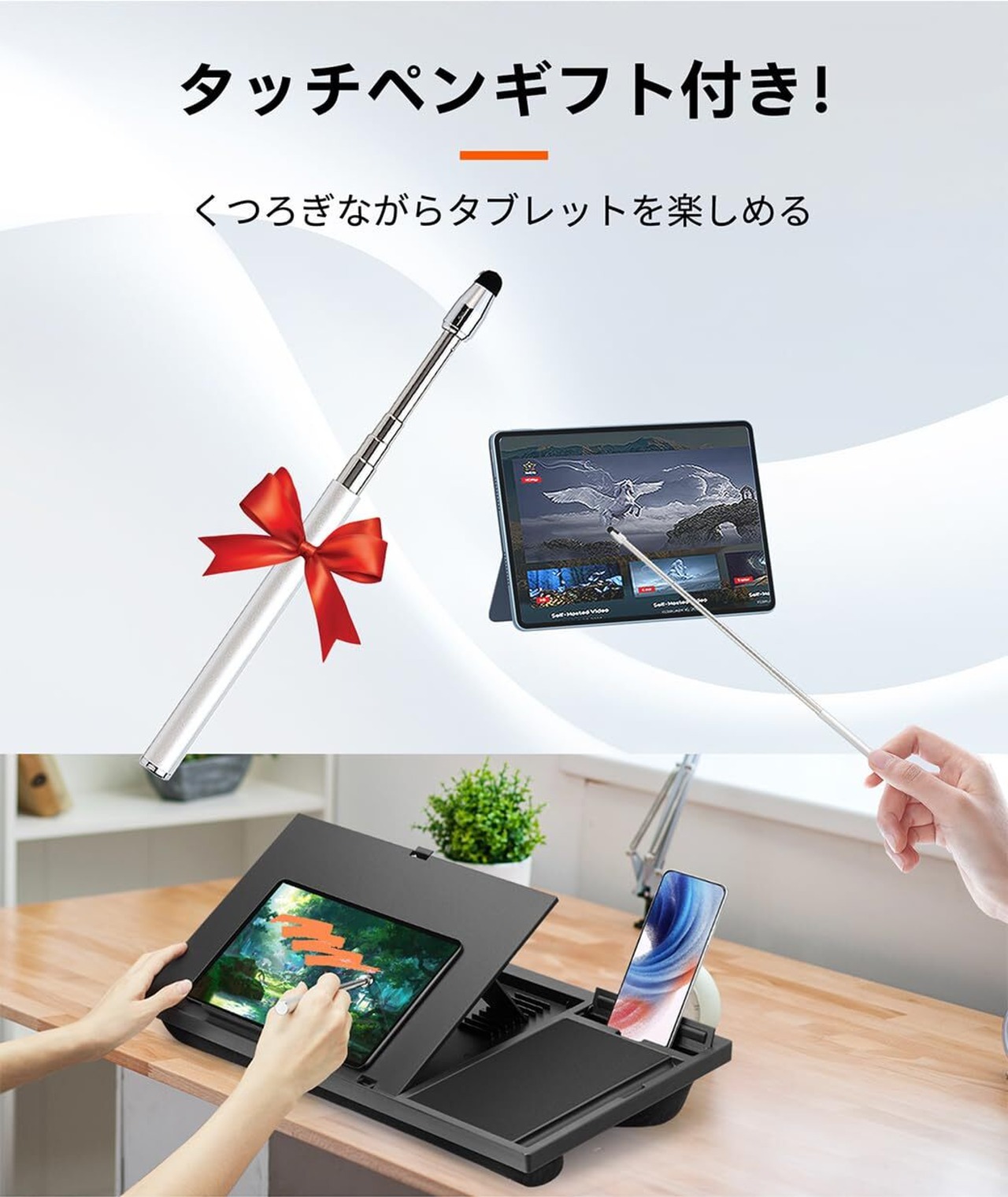 【タッチペン1本はギフト!】:くつろぎながらタブレットを楽しめるように、長さの伸縮ができるタッチペンを1本無料で付きます。ご利用する際に、画面との距離を、適切に保ち、目の健康を守りましょう。