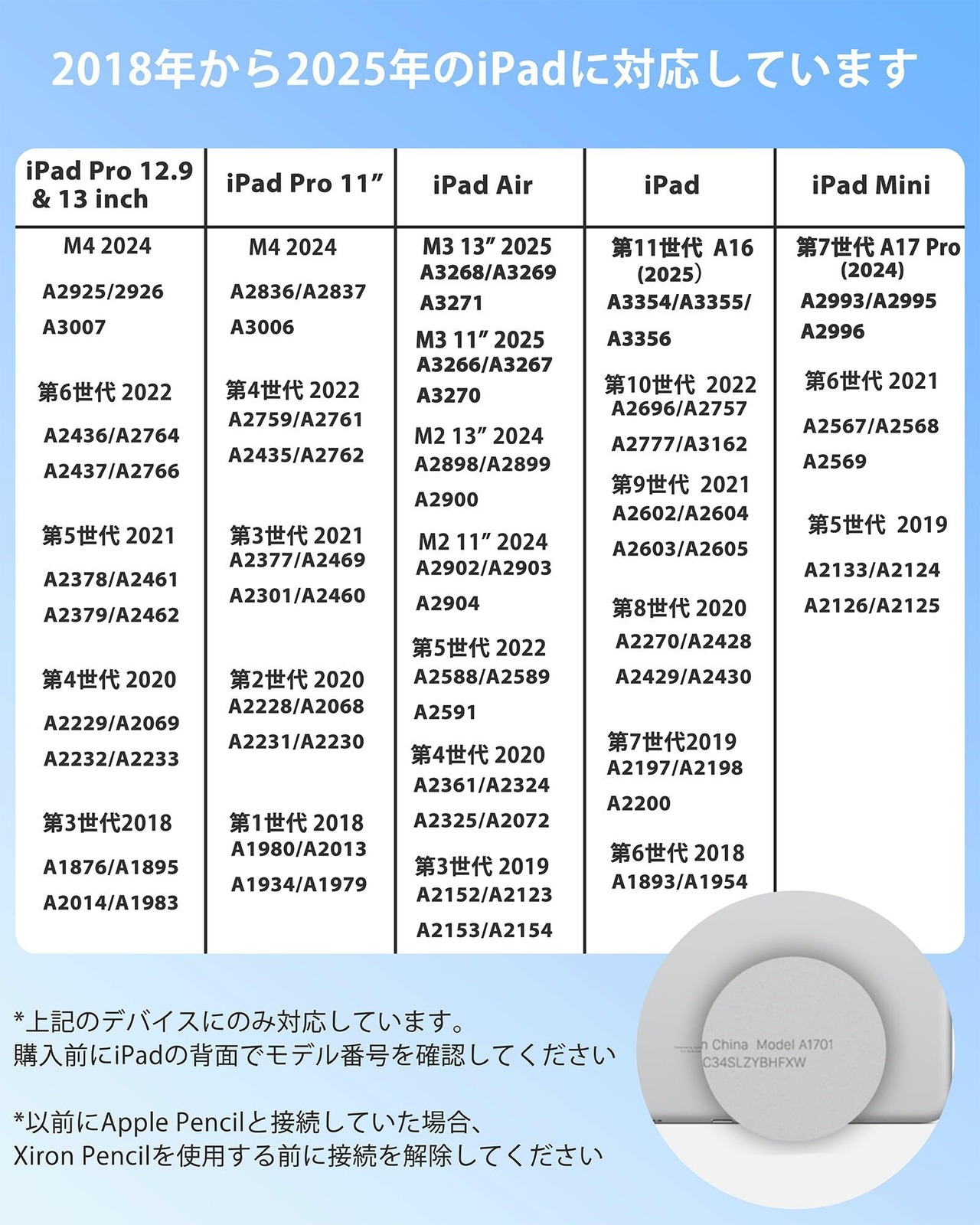 広い互換性:このスタイラスは、2018年から2025年のiPadモデルに対応しています。iPad Air 11インチおよび13インチ(M2) 2024/(M3) 2025、iPad Pro 11インチおよび13インチ(M4)、iPad 第11 世代 A16 2025、第10世代、iPad 9/8/7/6世代、iPad Mini 7 A17 Pro/6/5世代など、多くのiPadモデルと互換性があります。iPad 10世代ペンやiPadペンとしても使用可能で、スムーズな描画が可能です。購入前に[設定 > 一般 > 情報]でデバイスモデルを確認し、iPadとの互換性を確認してください。アップルペンシルのような性能を提供し、デザインやメモ作成が快適に行えます。