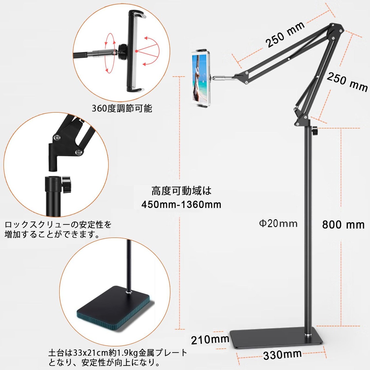 タブレット スタンド タブレット フロアスタンド 床置き 寝ながら 360度回転 高さ調節 フロアスタンド式 土台強化(重量:1.7kg) 下垂防止 スマホ スタンド 4.5〜12.9インチ for iPad Pro 、Kindle Fire 、N-Switch、android surface、iPhone 多機種対応
