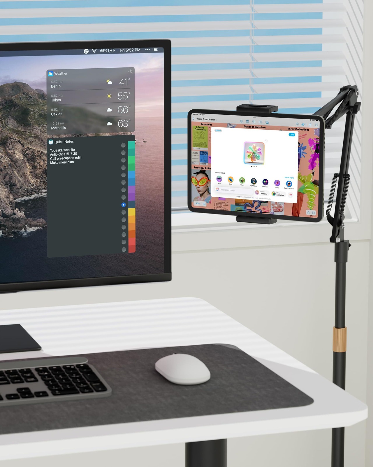 【伸縮ポール・360°回転】支軸の部分は伸縮式ポールを採用し、高度可動域は50cm-150cm、自由にお好みの高度を調節可能、ストッパーを締まって固定する。ホルダーの接続部分はボールジョイントを採用し、ホルダー挟み込み部分は360度回転でき、タブレットの画面を縦にも横にも変えられ、お好みの角度を調節できます。なおボールジョイントの背面に回転ノブを備えて、お好みの角度に調節して回転ノブを逆時計に締めて固定られており、ホルダーのズレを最小限に抑えてくれます。