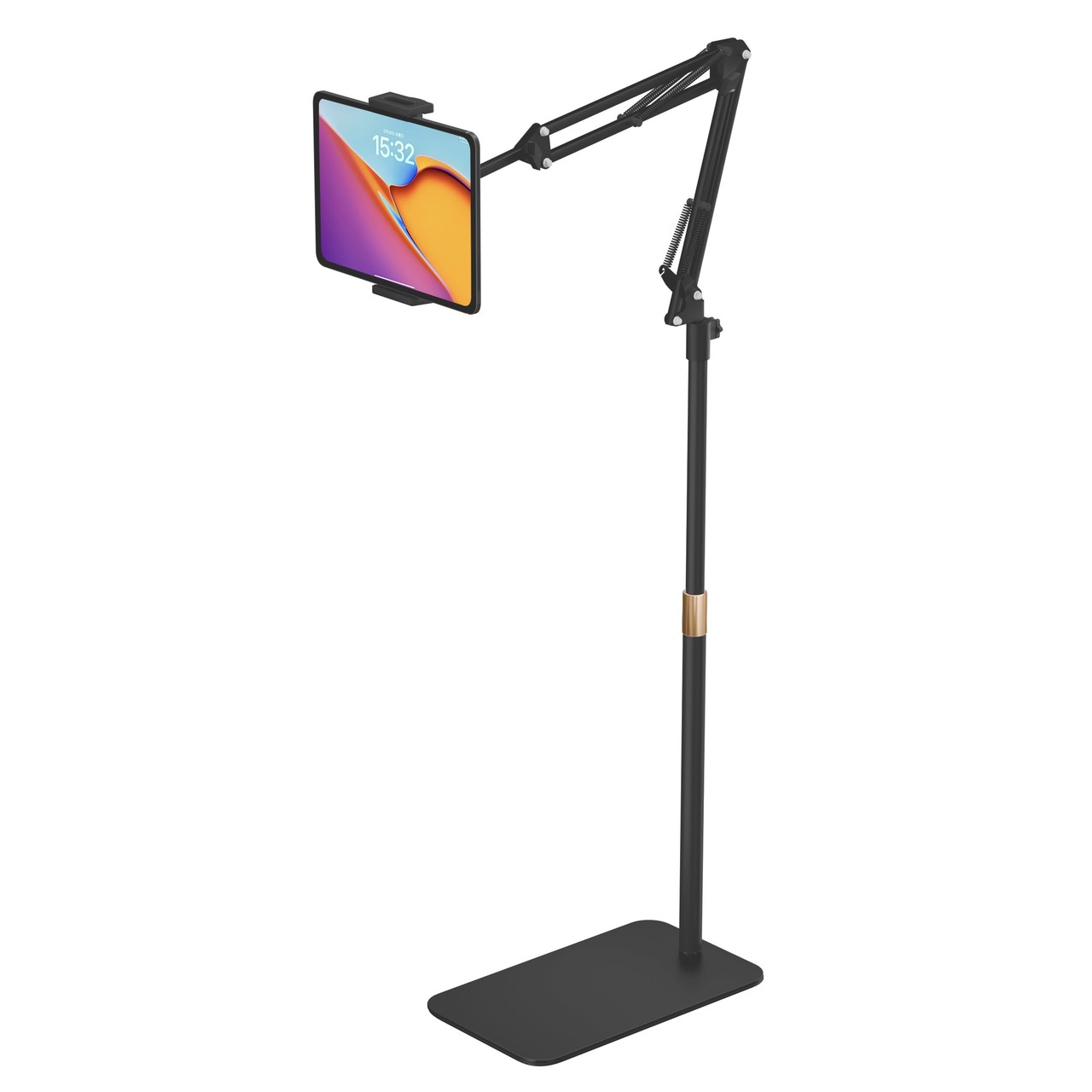 タブレット スタンド 伸縮式フロアスタンド iPad アーム 床置き 寝ながら 50-150CM高さ調整 約2.0KG土台 角度調整 4.7-15.6インチ対応 360°回転 土台強化 下垂防止 スマホ/タブレット/モバイルモニタ対応(ブラック)