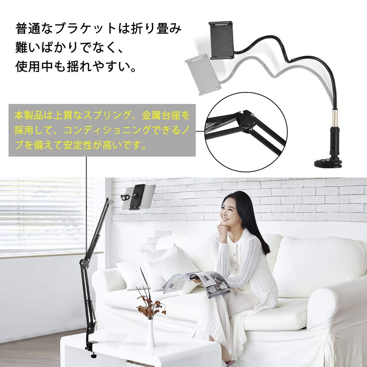 【耐荷重が強い】最大荷重:1800g: 頑丈で完全に調整可能な4段式アルミニウムアームと上質なスプリング付いたタブレットスタンドです。それに、上質なバスマットを備えたレベルアップの台座のため、使用時に安定性が高くて家具を損なわない。