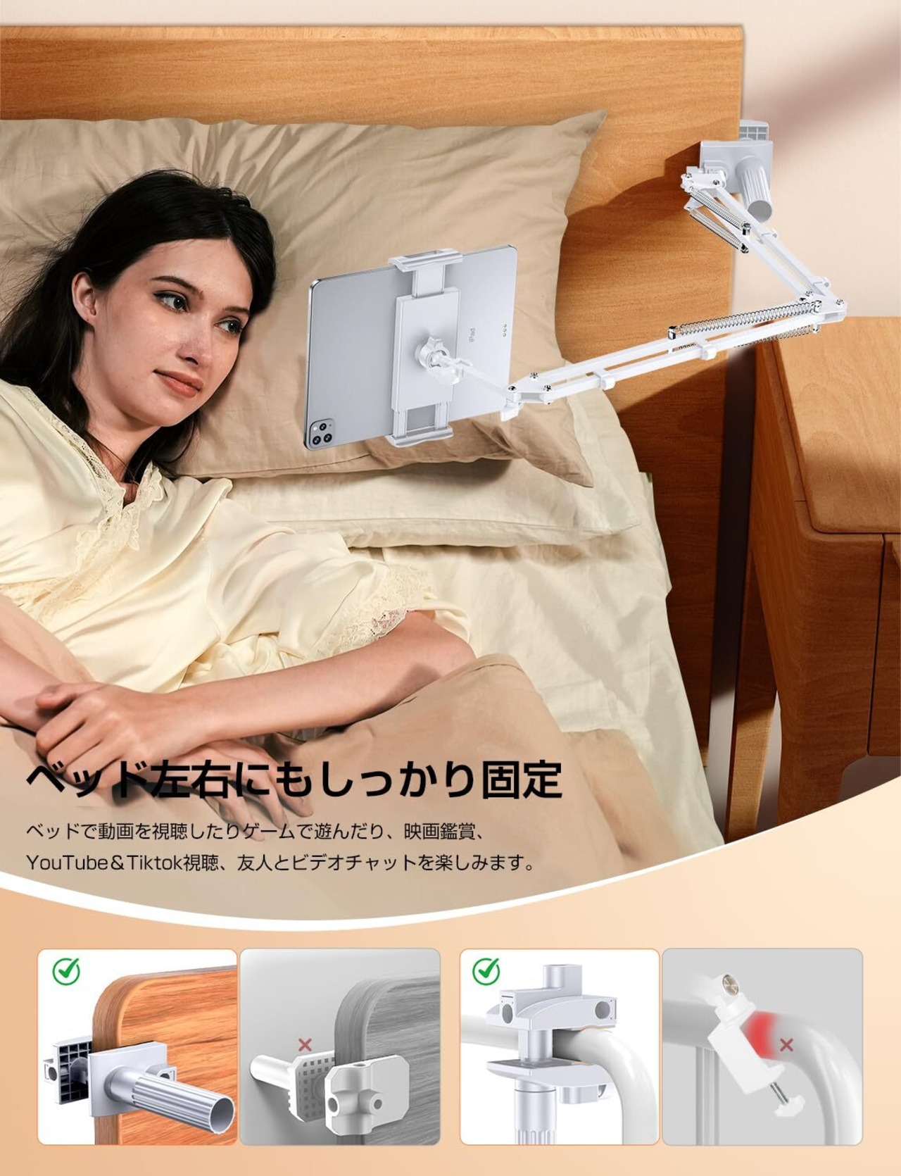 【4つケーブルクリップ付き・もっと便利に4-12.9インチ全機種対応】 ▶「ケーブルをスッキリに・充電ながら使用可能」Mumay進化し続けるタブレット スタンドは4つのケーブルクリップ付きなので、MagSafeケーブル、USB-C ケーブル等の直径3.5mm以下の幅広いケーブルに対応し、アームに固定すればケーブルをはめ込むだけでしっかり留められてケーブルの散乱や落下などを防げる。また、スマホで動画、ゲームを楽しんでいる場合に電源が切れるのを悩めない。YouTubeを見る、動画視聴、在宅勤務、オンライン授業に大活躍!▶「幅広い互換性・フレキシブルアーム」クリップ範囲:12.5-27cm、約4-12.9インチ機種に対応可能。厚いケースをつけていても利用可能。※ヒント:保護ケースをつけたままに製品をご利用になる方が、ご購入になる前に是非機体全体の厚さをご確認ください。※指を誤って挟んでしまう可能性があり、お子様だけでは使わせないようにしてください。