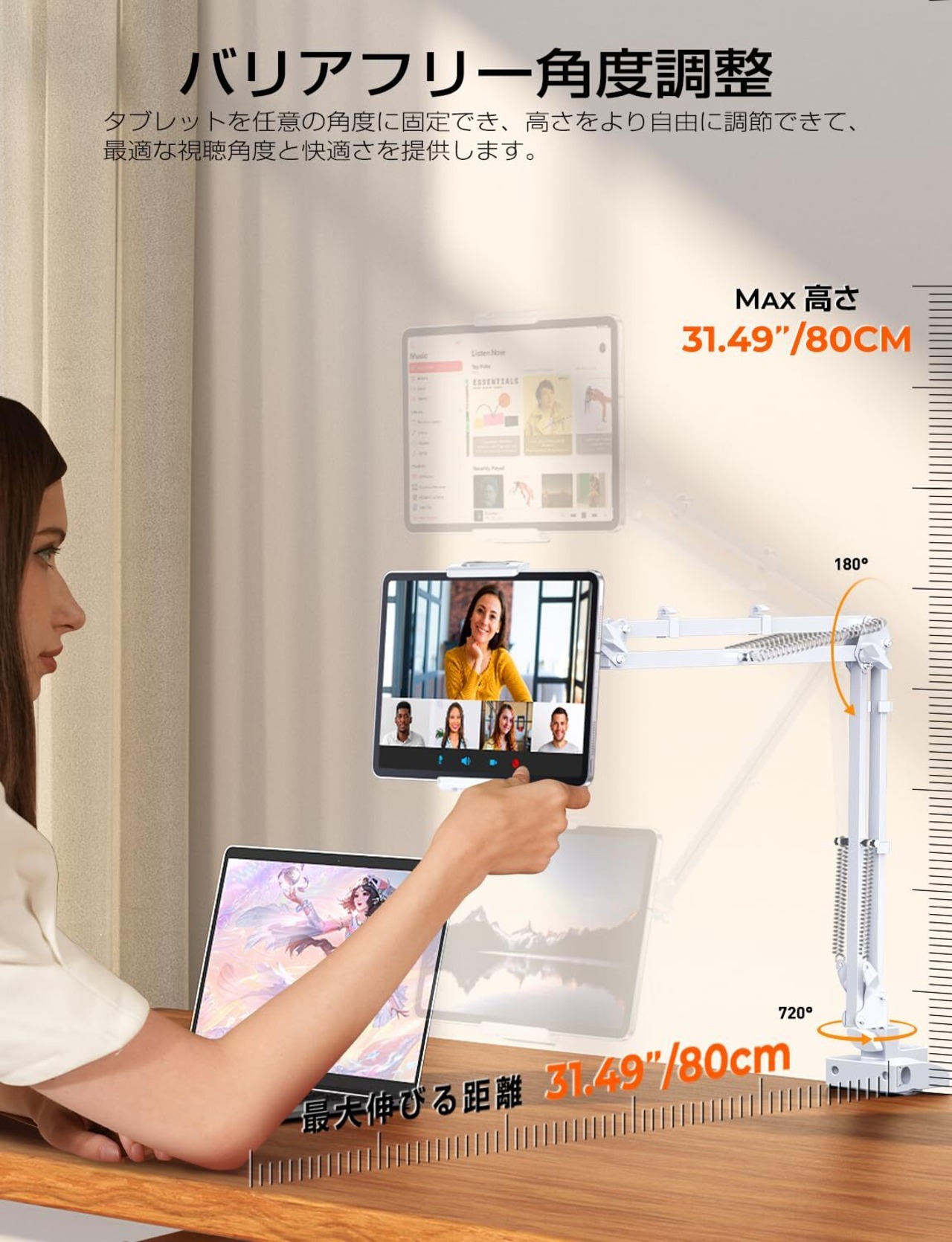 【回れる関節五つ!トップ延長アーム・バリアフリー角度調整】 ▶「五つの可動域・高さや角度自由に調節」新世代型破りな寝ながらタブレットスタンド、革新性と実用性を最優先に製品開発を進めてき、五つの可動域の最高傑作ipad スタンド アームが登場!五つの回れる関節と360°自由に回るボールを備えるにより、可動域はとても自由自在!スマートフォンやタブレットを任意の角度に固定でき、高さをより自由に調節できて、最適な視聴角度と快適さを提供する。▶「220°トップ延長デザイン・目線に合う」業界改良版でスマホスタンドのトップ部分は延長アームを採用し、220度回転可能で方向や角度などを自分好みに自由調整でき、優しいデザインは頚椎や視力を保護するだけでなく、見やすい角度で目線に合わせて近づけたり離したり調整可能。また、スマホを手で持つ代わりに固定することが出来るので、長時間快適に楽しむ。