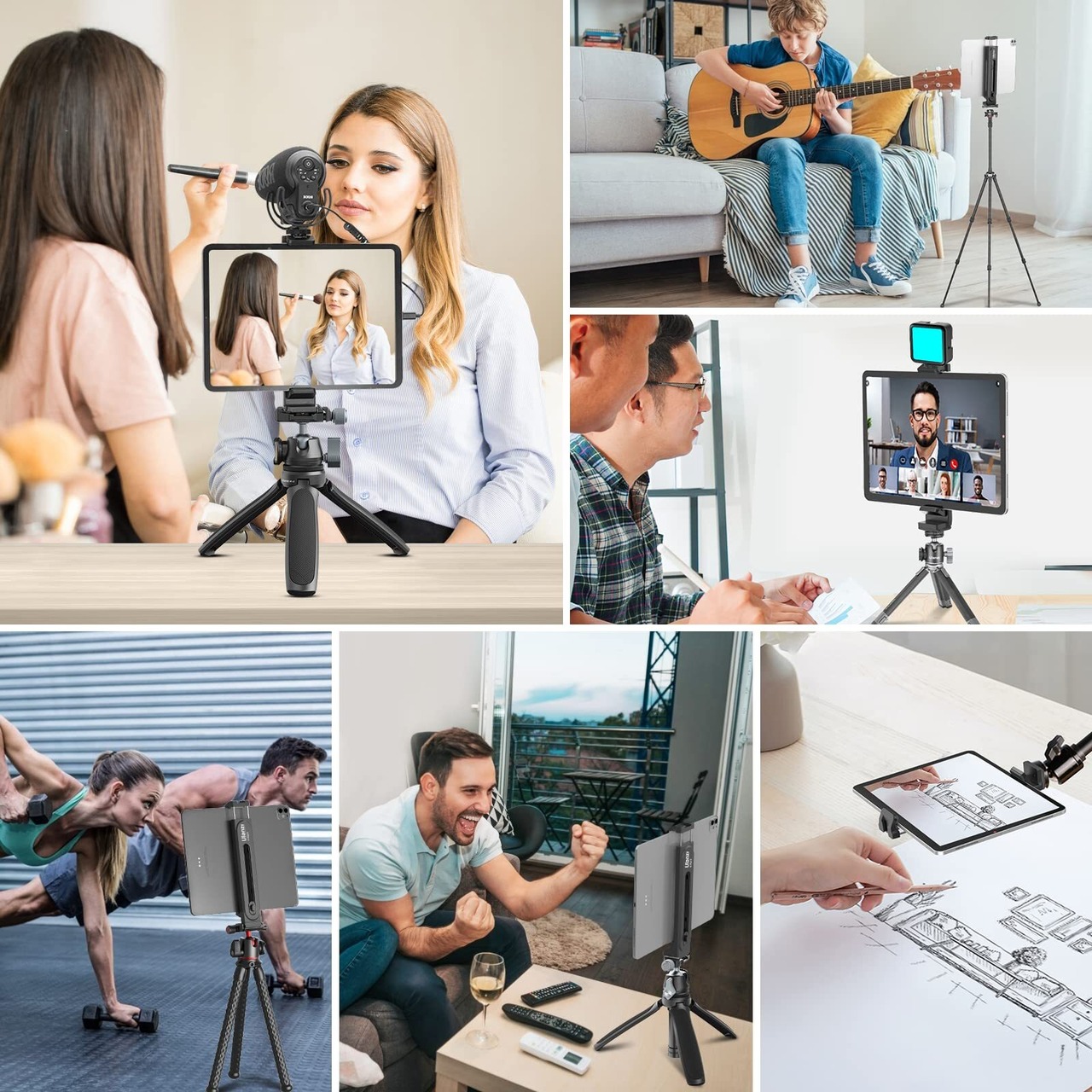 【コールドシュー&アルカスイス付き】このタブレットホルダーが上部にコールドシューを付いているので、LEDビデオライト、マイク、モニターなどの多くのアクセサリーを取り付けることができます。底部にアルカスイス規格、クイックリリースプレートが可能で、三脚や一脚に素早く脱着します。それだけでなく、スマートフォンやGoProアクションカメラをマウントすることもでき、プロ撮影、テレビ会議の照明、動画撮影、動画配信、動画の視聴などに利用できます。