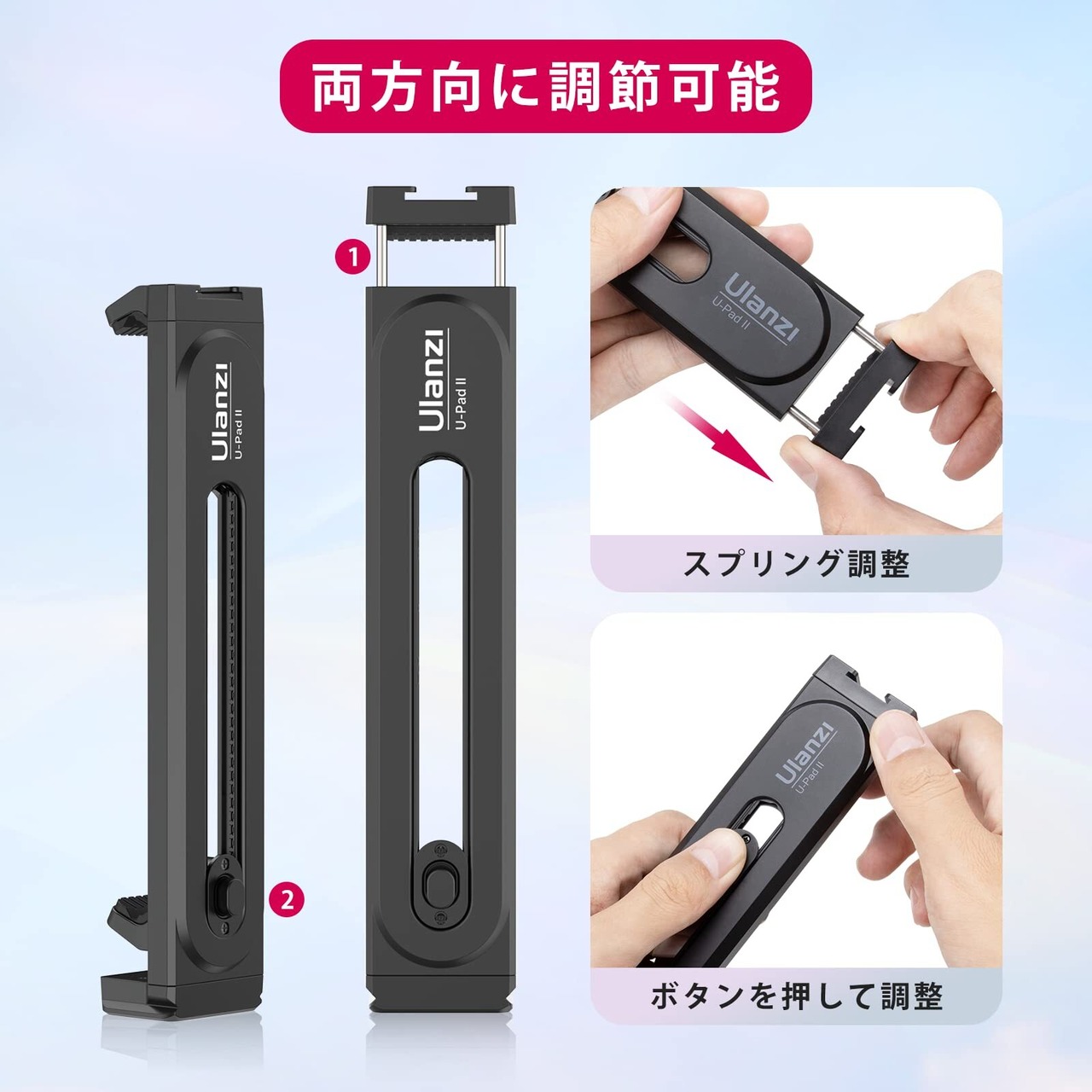 【ユニバーサル&幅広いアプリケーション】背面のボタンまたは上部のバネで両方向に調節可能な2イン1のスマホ/タブレット三脚マウントアダプターの調整幅は65mm-260mm(±5mm)です。iPadホルダーは4.7~12.9インチの範囲内での使用に適用です。上部も強いバネがついていてさらに伸びるので、大概の大きさのタブレットに対応できます。裏にあるプッシュボタン、簡単に幅が調整できます。iPhone、iPad Mini、iPad、iPad Air 、iPad Pro、Surface Go、ほとんどの携帯電話やタブレット端末の縦置き、横置きにサポートします。* 11インチ以上のタブレットを横方向でのみ使用できます。.