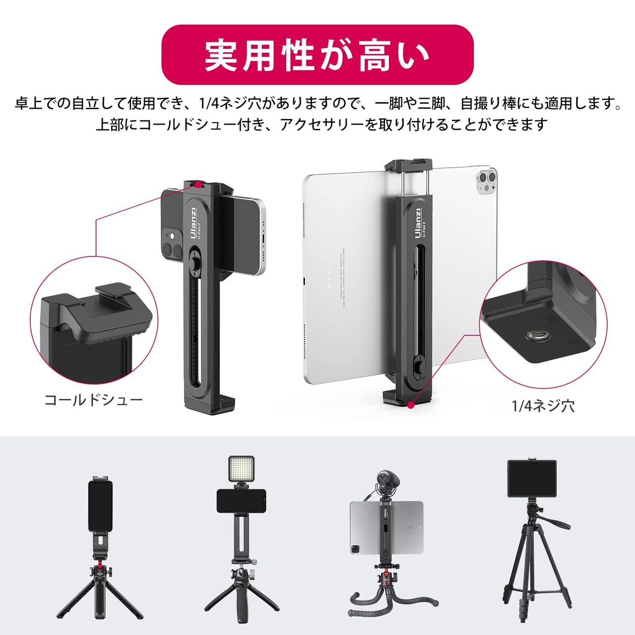 Ulanzi iPadホルダー 三脚マウント用 タブレットホルダー コールドシュー付き 三脚アダプターブラケット ユニバーサル アルカスイス 1/4ネジ穴付き 幅さ65mm~260mm iPad/iPad Air/iPad Pro/iPad mini/Galaxy Tab/Surface Go対応 すべてのiPhone Androidスマートフォンに対応