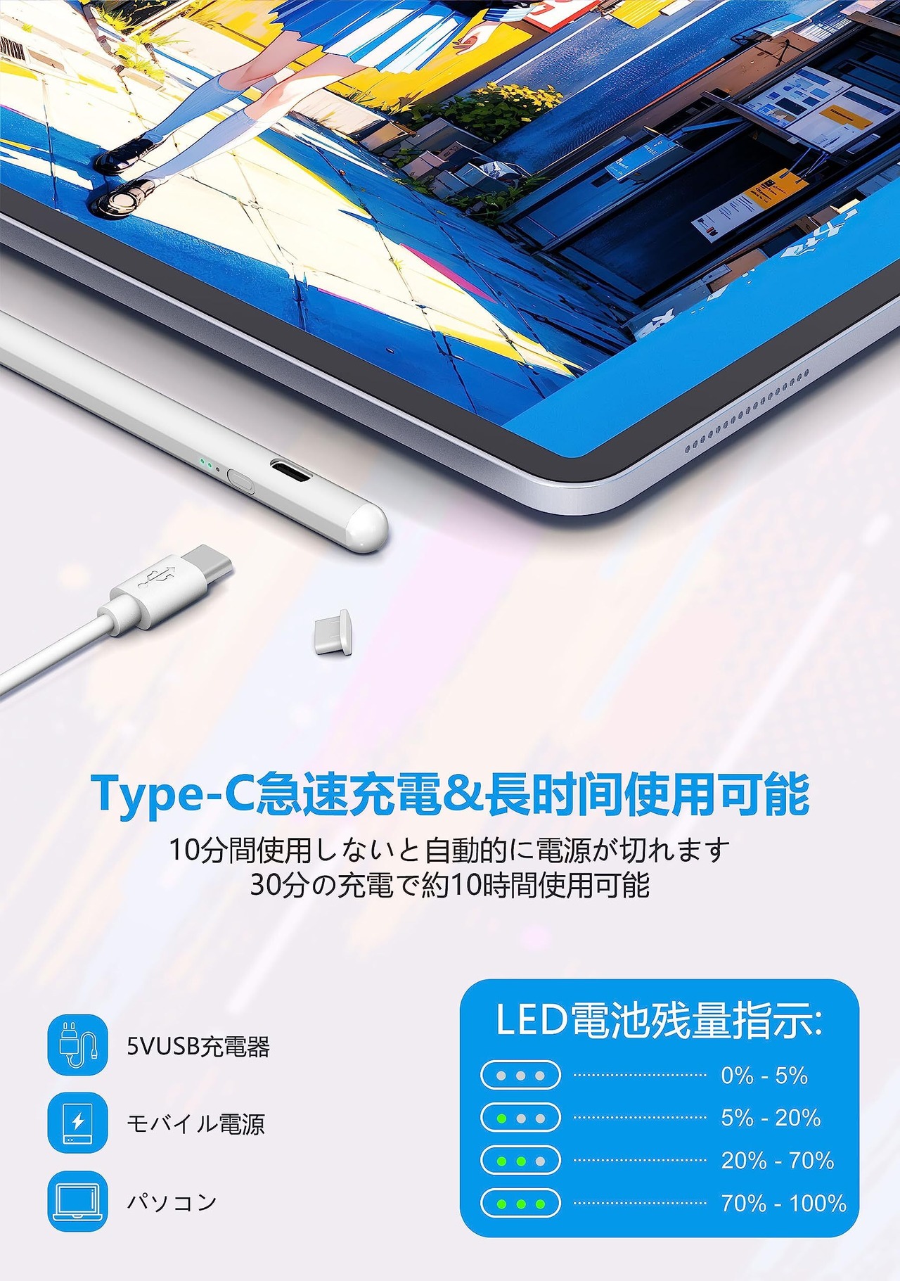 2025 最新 iPad ペン 第11 (A16)/10世代対応 傾き感知/磁気吸着機能/超高感度 タッチペン 誤作動防止機能 軽量 耐摩 USB type-c充電式 iPadペンシル第11 (A16)/10/9/8/7/6世代、Air 11"/13" M2/M3 2025 /Pro 11"/13" M4 2024 、Mini 第7/6 Gen、Air 3/4/5 Gen に対応