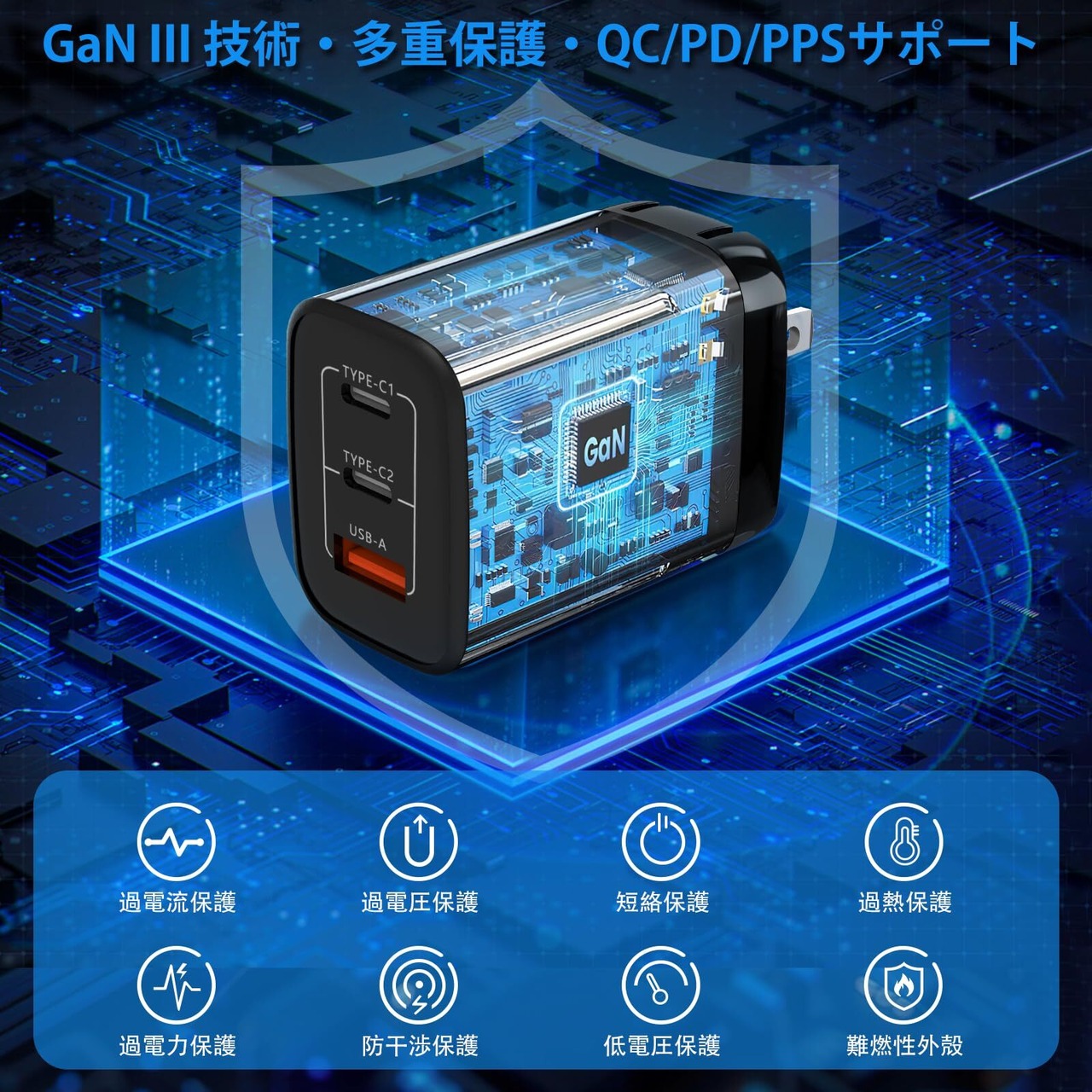 【最新のGAN IIIチップ搭載】この充電器はGAN III技術を採用し、多重保護機能を搭載し、高品質のマイクロGaNチップを使用して、エネルギー使用率を向上し、熱散能力を高め、充電器をより安全で効率的に動作します。過電圧保護、過電流保護、過充電保護、過熱保護、短絡保護、低電圧保護、防干渉保護を搭載し、充電器と充電設備を守ります▶ご注意:全速充電する時、充電器は発熱し、熱くなるのは正常症状です◀