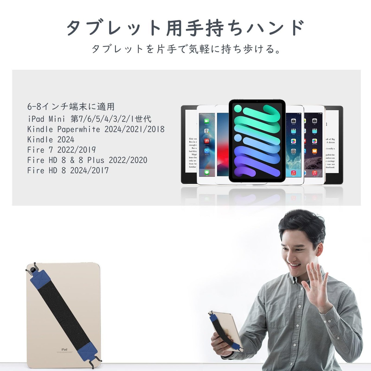 TiMOVO タブレットバンド 1個入り タブレットPC用安全ハンドストラップ タブレット用 安全ハンドストラップ 片手持ち 落下防止 取り外せる 6-8インチ対応 対応-iPad Mini7/6/5/4世代、kindle paperwhite、Fire7、Fire HD 8&8 Plus、iPlay50 mini/miniPro/miniLite、HeadwolfFPad3 黒バンド+インディゴ