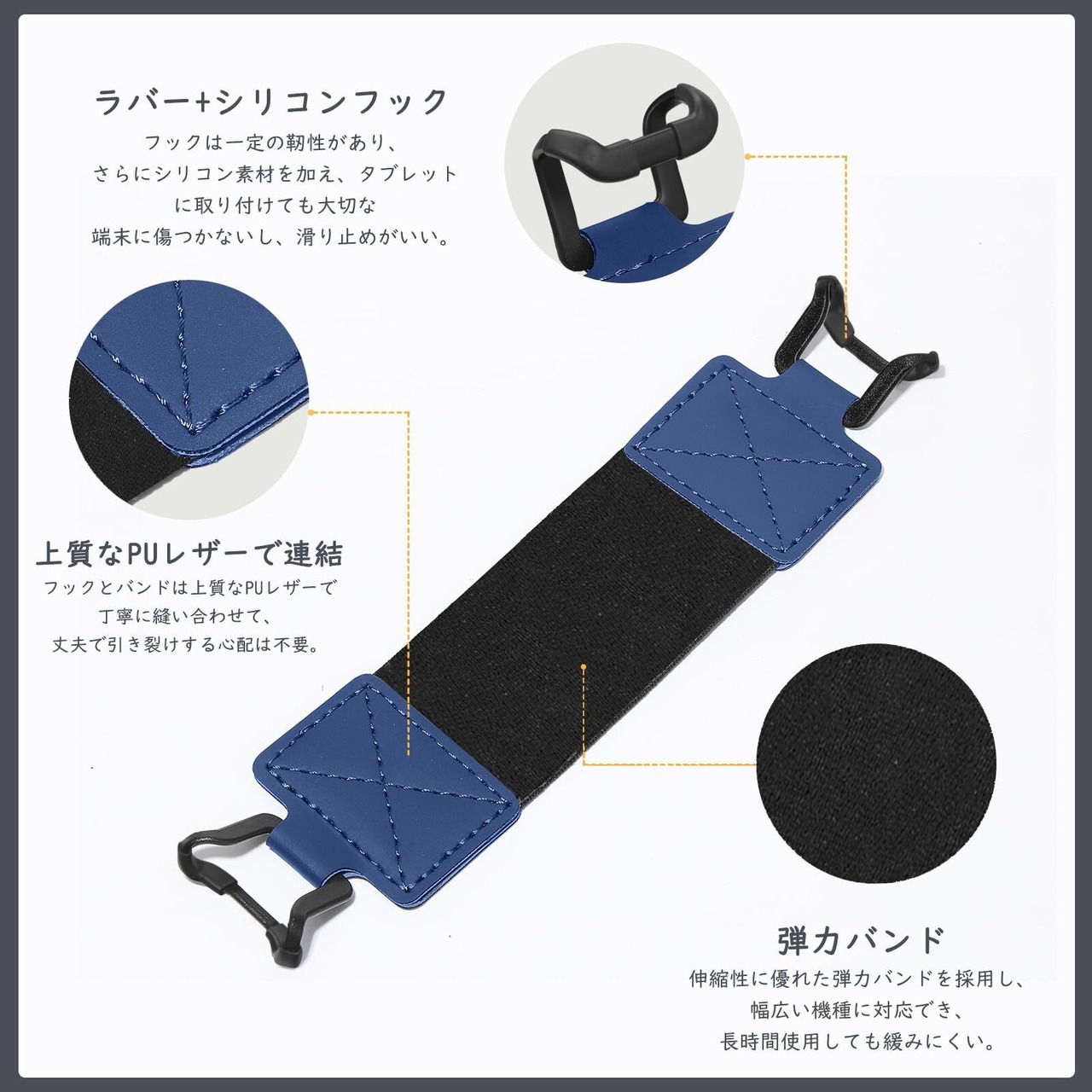 「伸縮性のいいバンド」 優れた伸縮性がある弾力バンドを採用し、幅広い機種に対応でき、長時間使用しても緩みにくいです。上質なPUレザーを使用してフックの部分と丁寧に縫い合わせて、丈夫で引き裂けする心配は不要です。フックの部分は一定の靭性があるラバー素材を採用し、タブレットに取り付けても大切な端末に傷つきません。