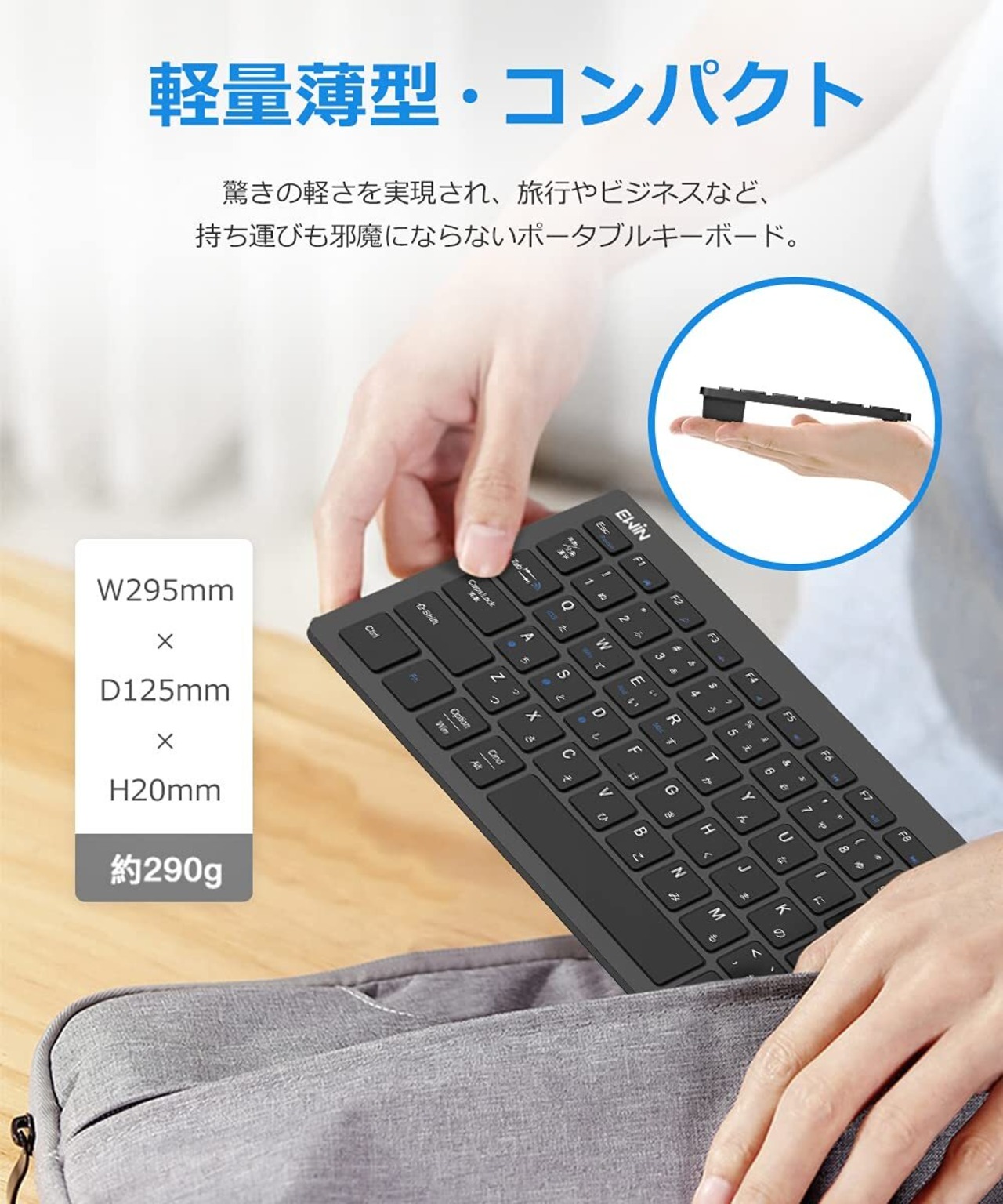 「薄型軽量ながら高い耐久性を実現」 サイズは29×12.5×1.8cm、軽量約290g、外枠がスリムな薄形コンパクト設計で持ち運びに最適! さらに、300万回を超えるタイピングテストを行い、耐久性を実証。薄型軽量ながら耐久性にも優れた薄型キーボードを実現しました。 キータイプには、ノートパソコンのキーボードと同じ、軽い力で打鍵できる「パンタグラフ方式」を採用しています。パンタグラフ式なので、キーボードのキーが取り外すことができます。お子様が誤って飲み込んでしまう危険がありますので、絶対にお子様の手の届かないところに保管してください。 ※予告なく仕様を変更することがあります。予めご了承のほどお願い申し上げます。