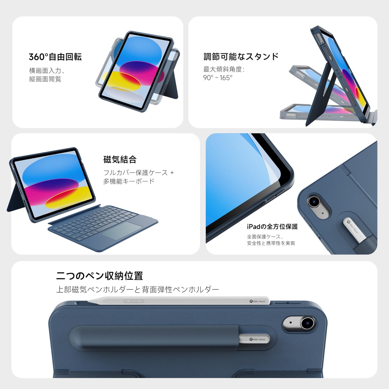 HOU対応 iPad 11インチA16 2025/10世代 ケース キーボード、iPad第11/10世代用回転式&着脱式キーボードケース、伸縮性ペンホルダー、完全保護カバー、7色バックライト、マルチタッチトラックパッド、日本語配列、ブルー