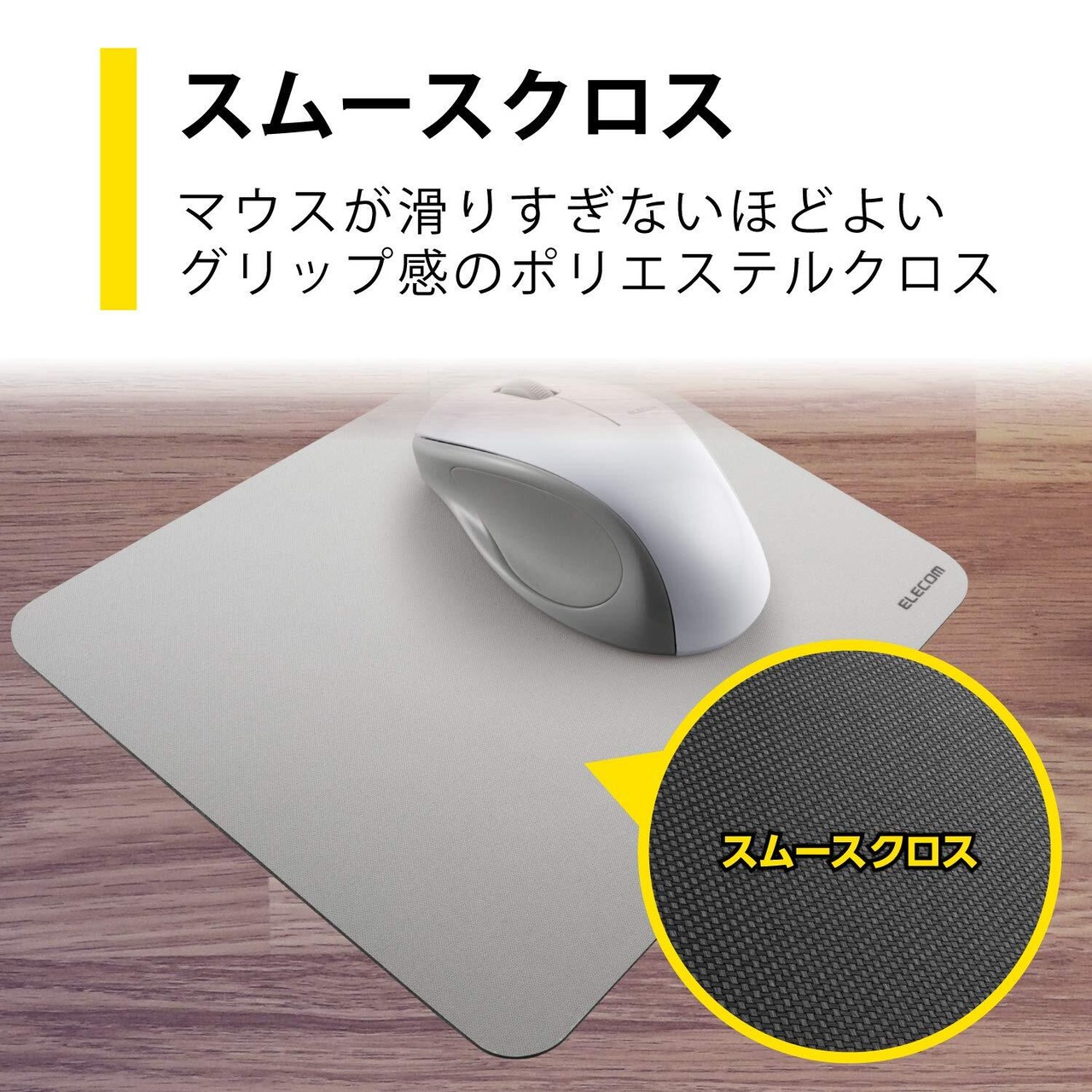 スムースクロス採用。マウスが滑りすぎない程よいグリップ感のポリエステルクロスを使用した標準サイズのシンプルマウスパッド