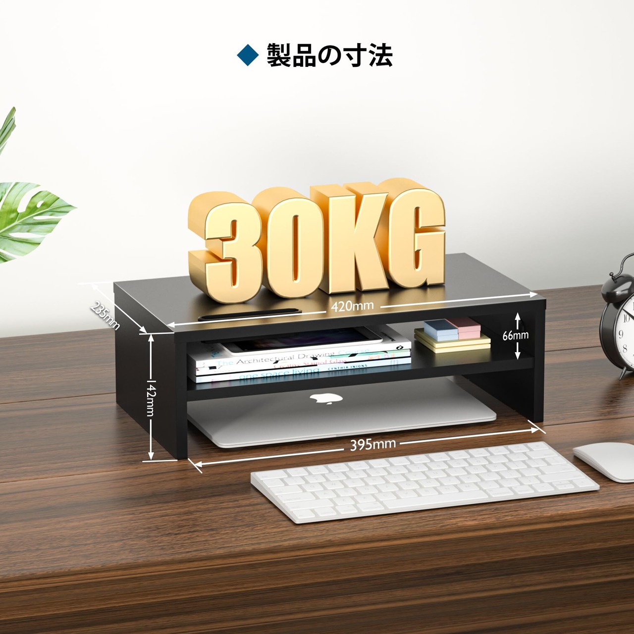 【多機能デザイン】モニター台は真ん中に棚板があり、2段式のデザインです。安定性を維持するための強化された4つの滑り止めパッド、スマホ用のスロット、ケーブル収納のハブ、省スペースのキーボードスライドを備えた生活に便利なデザインです。ディスプレイ台は耐荷重は30KGで、自宅、オフィス、リビングルーム、ベッドルームにすっきりとしたデスクトップをもたらし、デスクトップスタンド、ラップトップスタンド、PS4、PS5、SWITCHなどのゲーム機スタンド、またはコンピュータースタンドとして使用するのに最適です