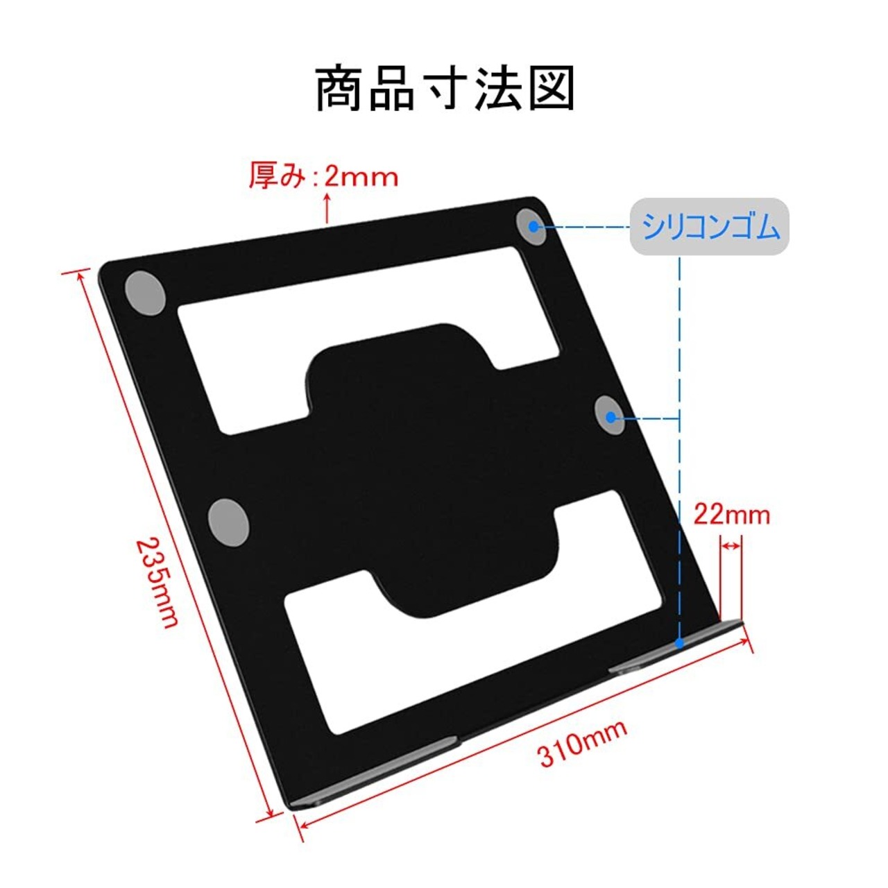 装置に傷や滑りが生じないように、マウントトレーの六箇所にシリコンゴムが配置されています。ベントは通気性を大幅に向上させ、ラップトップを涼しく保ちます。