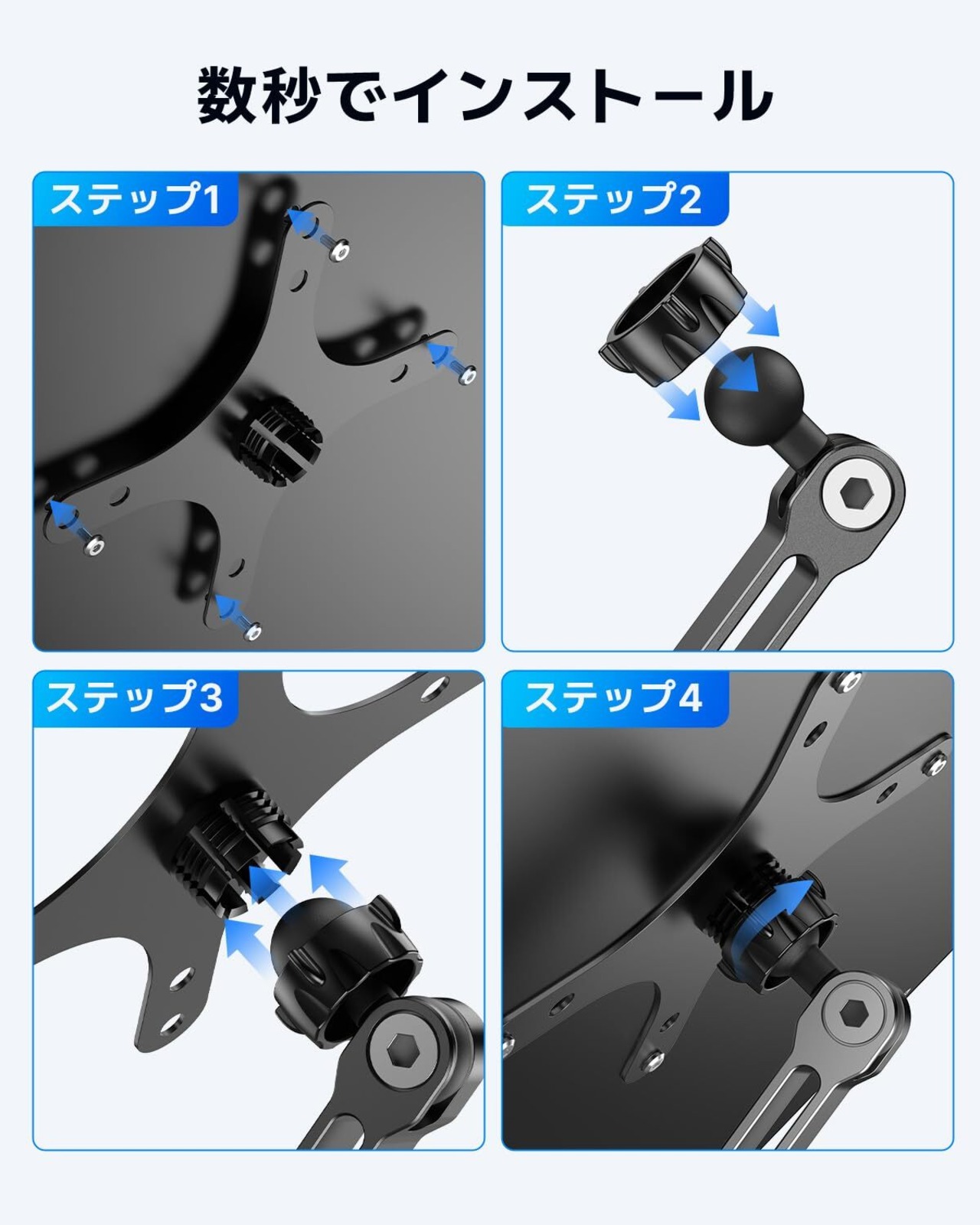 【4ステップ・数秒でインストール】 まずネジでVESAボードをモニターの背面に固定し、次にゴムリングをベーシックモニターアームに置き、次にVESAボードをゲーミングモニターアームに嵌め込み、最後にゴムリングを締めて取り付けが完了します。取り付けには4つの簡単なステップのみが必要で、シンプルかつ効率的です。まだ、従来のクランプ式やグロメット式と比べて、新しいポータブルモニターアームはテーブルに傷を残さず、リアルな生活シーンにより適しており、より実用的です。何か気になる点やご質問などがございましたらお気軽にsupportjp at newsoul dot storeご連絡ください。ご要望に合わせて対応させていただきます。