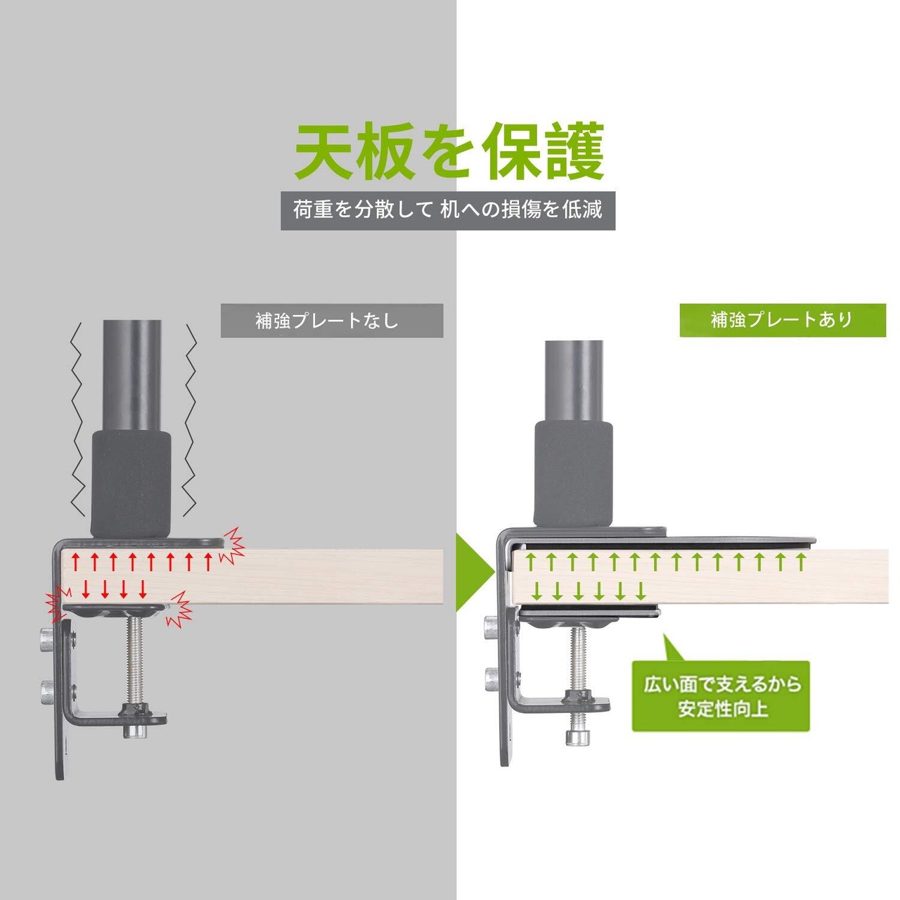ZepSon モニターアーム補強プレート 取付部硬さ強化対策 デスク保護 傷防止 滑り止めシート付き