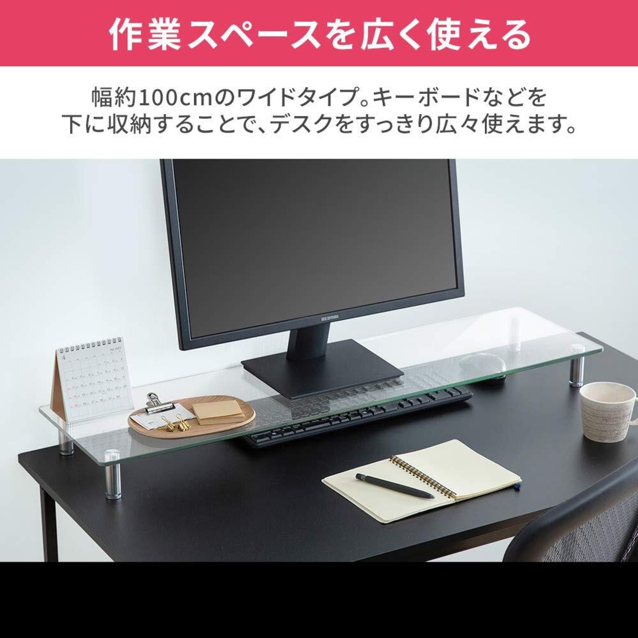 アイリスオーヤマ デスクがスッキリするモニター台 幅100cm ガラスタイプ 収納領域の大きなワイド設計 目線が上がるので首肩の負担が軽減 インテリアになじむシンプルデザイン ほこりが溜まりにくいフラット設計 モニター台 パソコン台 ディスプレイ台 机上台 PC台 プリンタ台 キーボード マウス収納 幅約100×奥行約26×高さ約8-9.3cm MNS-1000G