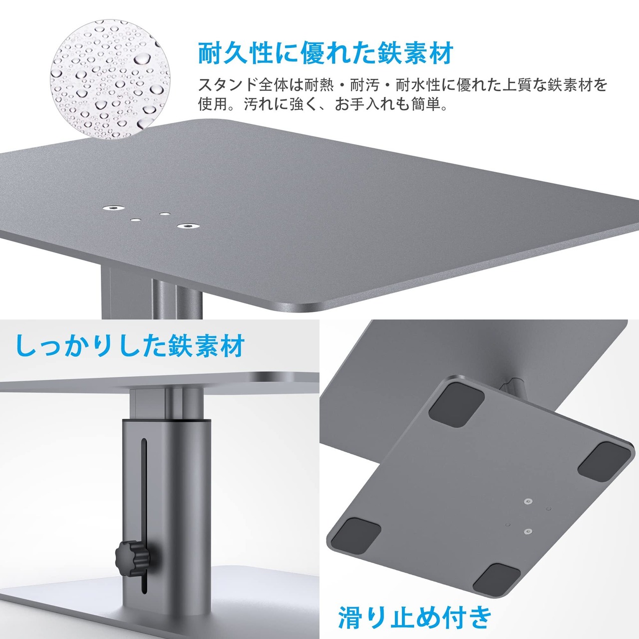 【金属製で安定感抜群】:重量:約2.8kg。モニター台の全体は高級感のありしっかりと安定感のある鉄素材を採用、耐荷重は最大15kgと頑丈な作りで、パソコンのディスプレイだけに適用することではなく、プリンタ台、テレビ台としても最適です。また、モニタースタンドの底面には、デスクが傷ついたり机上台がズレたりすることを防ぐ4つのクッションも付いて安心です。
