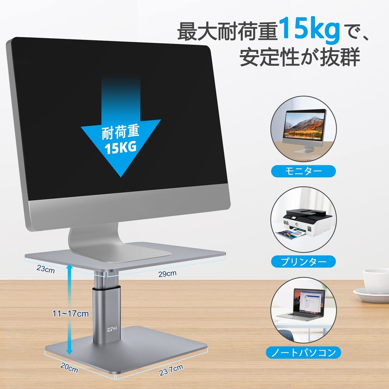 【高さ調節で姿勢改善】:商品サイズ(cm):(天板)幅約29cm×奥行約23cm、(底板)幅約23.7cm×奥行約20cm、高さ11cm~17cmまで調節。モニタースタンドの支柱のネジで高さが11~17cmまで無段階で調節することが可能で、作業しやすい好みの高さに合わせて最適な目線にディスプレイの高さを調整することができます。視線が上がることで猫背などの悪い姿勢が解消され、肩こりや首痛や目の疲労も軽減し、お仕事の効率も改善できます。(ご注意:スペースが足りないことを避ける為に、卓上のスペースをご確認の上でお買い求めください。)