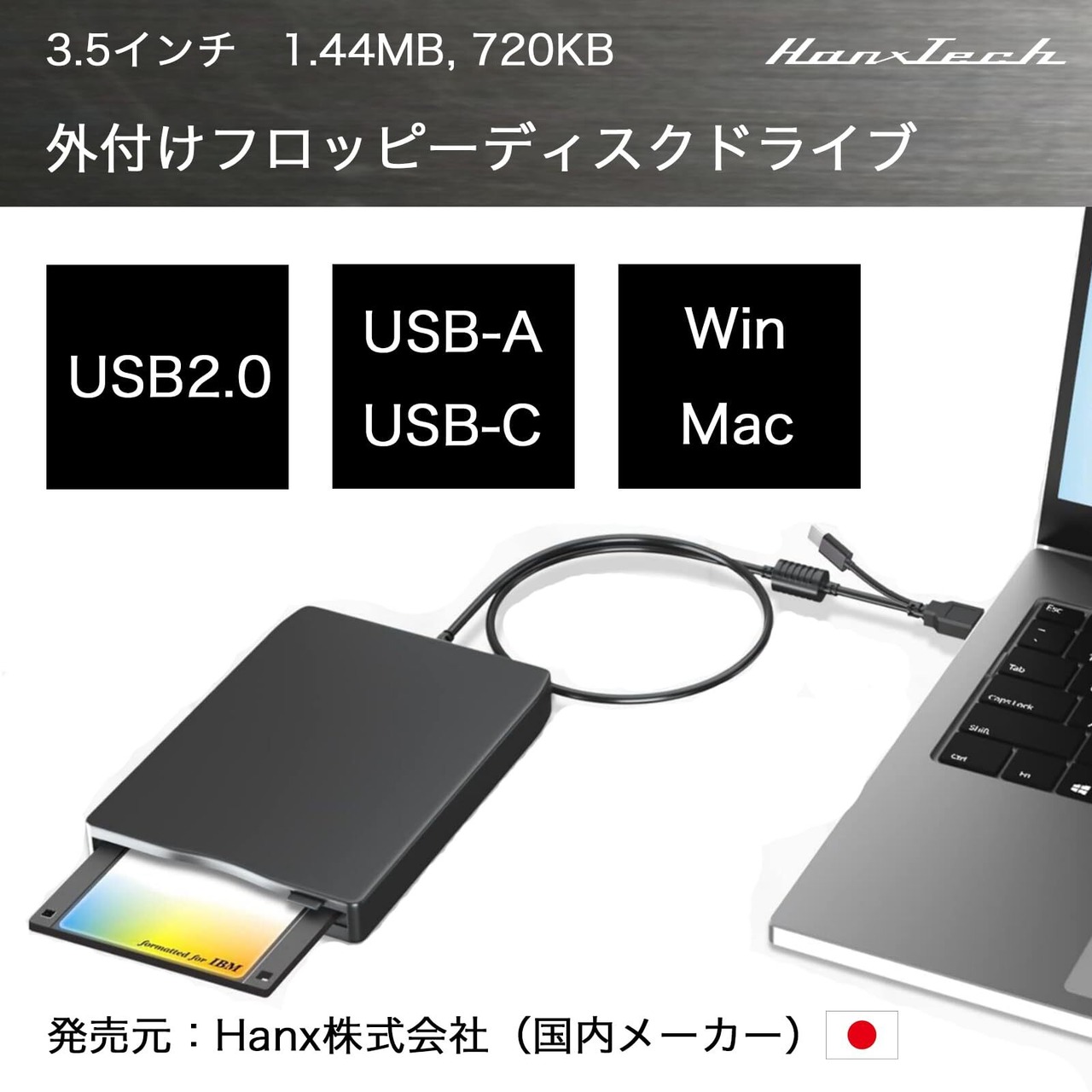【限定モデル】Hanx-Tech(ハンクステック/日本メーカー) USBフロッピーディスクドライブ 外付け 2024年モデル 3.5インチポータブル 1.44MB 720KB USB-C USB-A USB Type-C Type-A PC用 Windows Mac インボイス対応 HT-FD31BA
