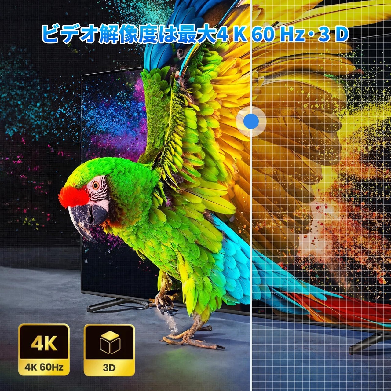 4K@60Hz 高解像度&高速伝送 最大4K(3840×2160)@60Hzの超高画質に対応。2560×1440や1080Pにも対応し、10.8Gbpsの高速転送で映像と音声を遅延なく同期させます。※HDMI→DPの逆方向変換は不可