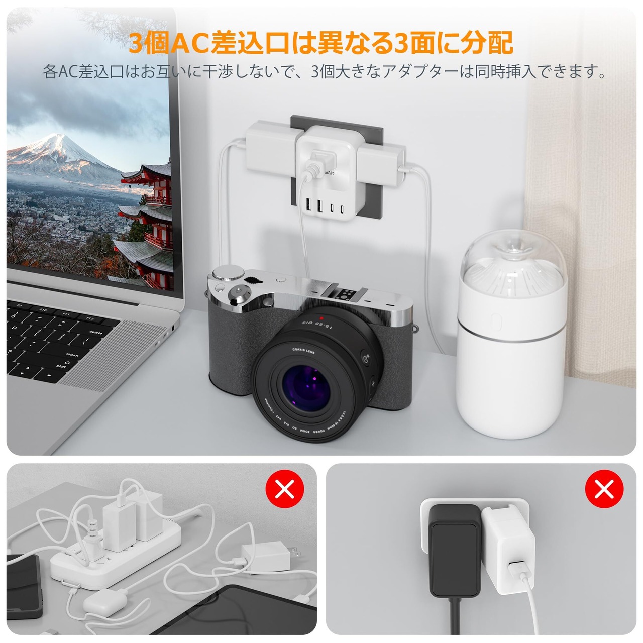 【3AC+2USB-A+2USB-C】従来の伝統的なこんせんと たっぷと違って、type-cポート及びtype-aポートが同時搭載している壁直差しタップです。また、2個のusb-aポート、2個のusb-cポートと3個のac差込口を搭載しているusb コンセントタップです。これ1つのusb アダプタ 電源タップで、7台の電子機器を同時に充電できます。3個のAC口は異なる三つの方向に配置されていて、お互いに干渉しないで、大きなアダプター同士が同時に挿入しても大丈夫です。