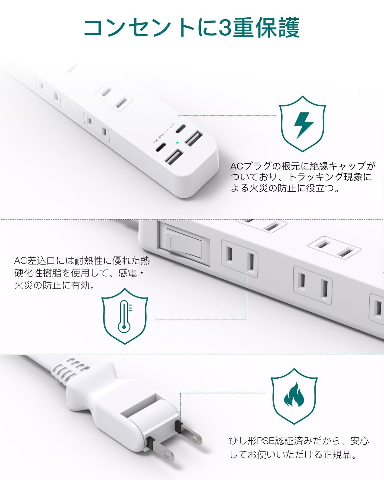 【雷サージ保護機能&コンセント4重保護】雷サージ保護機能より、サージ、電圧スパイク、電圧ノイズ、静電気による干渉を排除し、電気製品の耐用年数を効果的に延長します。電気火災を防ぐため、ACプラグの根元に電気を通さない絶縁キャップがついており、トラッキング現象による火災の防止に役立ちます。さらに、AC差込口には、万一の発熱の際にも融解しにくく、電気火災の防止に有効な耐熱性に優れた熱硬化性樹脂を使用しています。電源コードには、二重被ふくコードを採用していますので、断線や被ふく破れによる感電・火災の防止に有効です。
