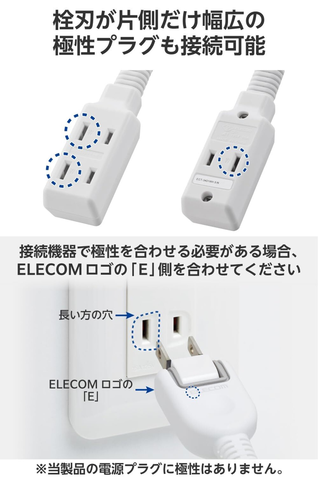 電源プラグには極性による栓刃幅の違いはありませんが、接続機器で極性を合わせる必要がある場合、コンセントの長い方の穴と電源プラグにあるELECOMロゴ(ELECOMとだけ書かれている面)の頭文字「E」側を合わせて挿し込んでください。