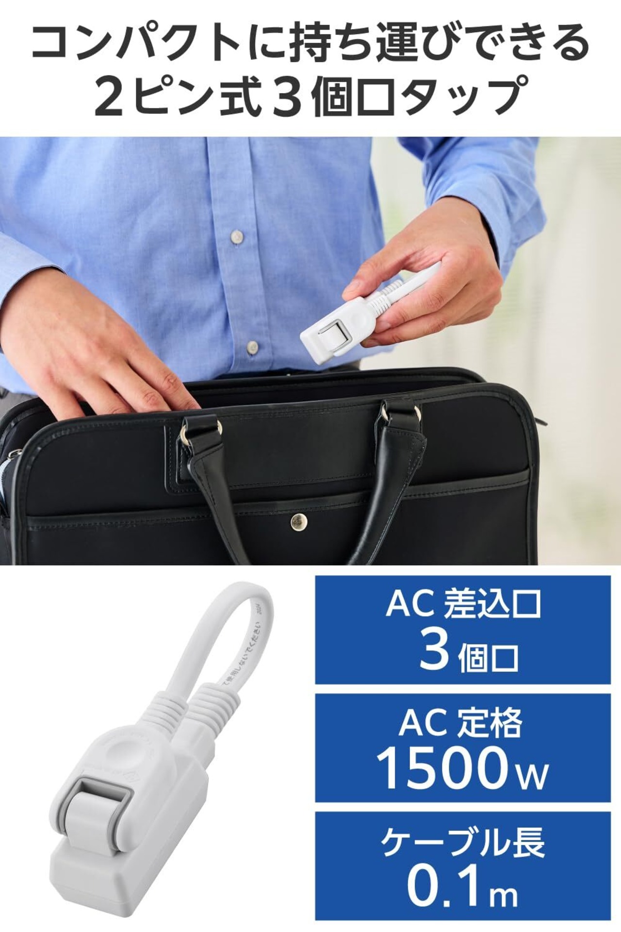 ■プラグを差込口に接続することでコンパクトにできるため、カバンなどに収納する際もかさばらず、持ち運びに便利な2ピン式3個口のタップです。