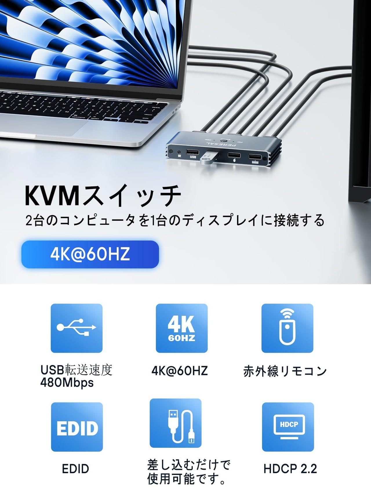 PERESAL KVMスイッチ 1モニタ 2コンピュータ: このKVMスイッチは、2台のコンピュータ/ラップトップが1台のモニタと1セットの有線またはワイヤレスキーボード マウスおよびその他のUSBデバイスを共有することをサポートします