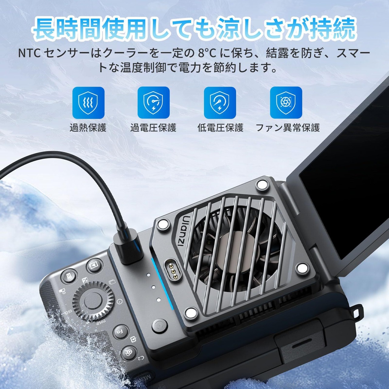 【3000mAh充電池内蔵&使いながら充電】3000mAh 磁気バッテリーはフル充電時で弱風最大約85分間、強風最大約70分時間の連続使用が可能で、外出先でもカメラを涼しく保ちます。Type-Cコネクター、外部電源バンクとの接続オプションにより、使用中に充電することができます。ご注意:充電には5V充電器をご使用ください。