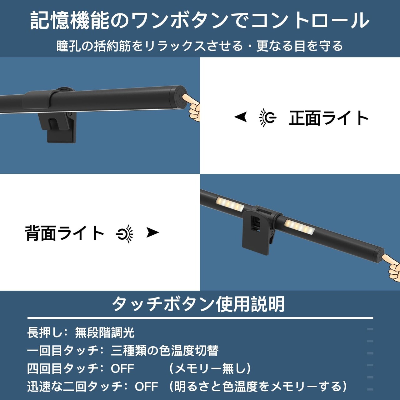 【ブルーライトカット●記憶機能】本モニター掛け式ライトのブルーライトカット率は約64.67%、強力にカットしてくれます。ブルーライトのカット効果だけでなく、非対称配光で直接目に当たらずに眼精疲労から目を守ってくれる効果も期待できます。 【メモリー機能】消灯時の明るさと色温度を記憶し、次の点灯時に同じ設定で再点灯します。