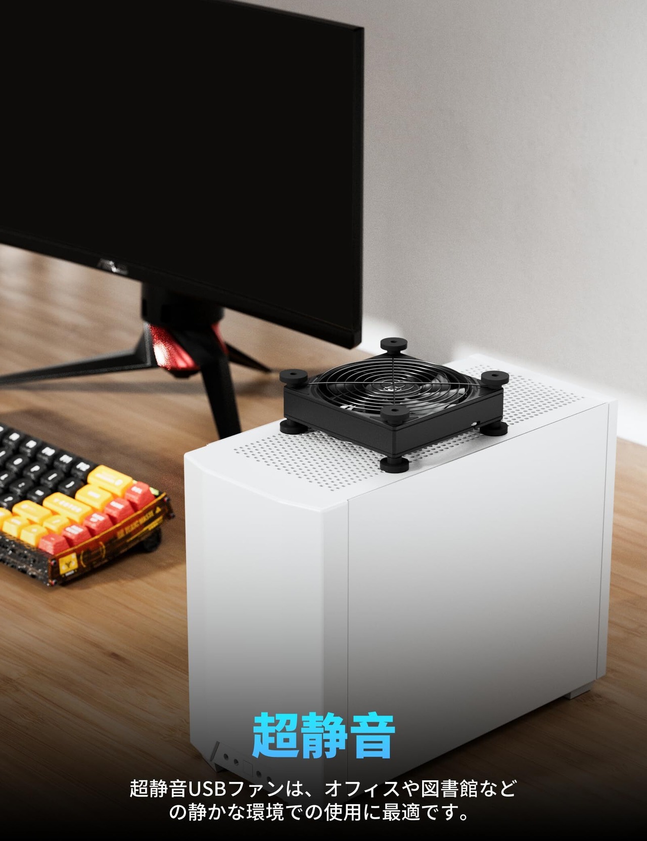 【幅広い実用性】usbファンは、多目的に使用でき、スペースを取らないように設計されています。 平置きにも縦置きにも便利で、さまざまな場所に設置できます。外付けHDD、ルーター、PC、水槽、ゲーム機などの電子機器の冷却ために設計された冷却扇風機であり、卓上ファンとしても使用でき、スマホやタブレットの熱を下げり、車中泊 換気扇や空気循環などのシーンでも活躍します。