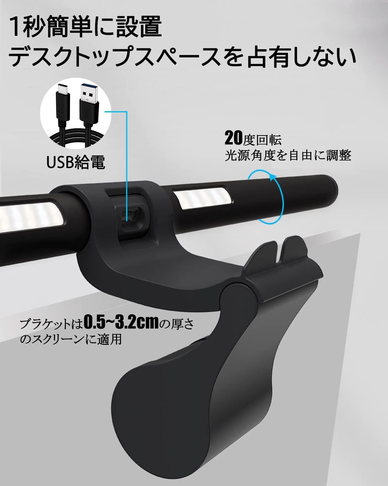 【便利なUSB給電式+記憶機能】USB給電式なので、PCのUSBから給電するなら、PCと一緒にON/OFFできます。電源をオフにすると、ランプはこれまでの使用輝度、色温度などを覚えて、次回使用するときにオンにして、再設定する必要はありません。