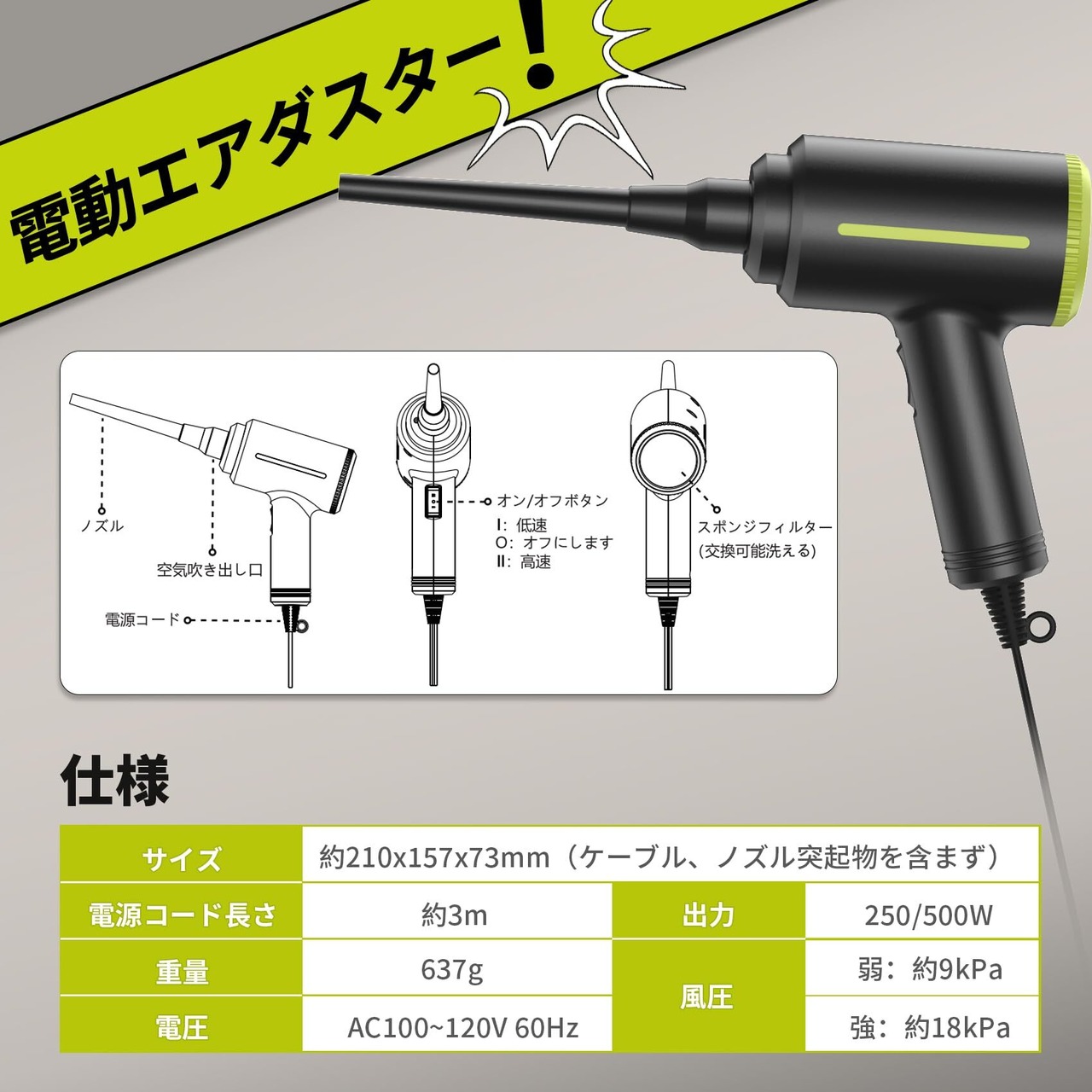 ATEngeJP 電動エアダスター 500W/260W 2段階風量 3mコード 3種類ノズル PC/キーボード用 強力ホコリ除去