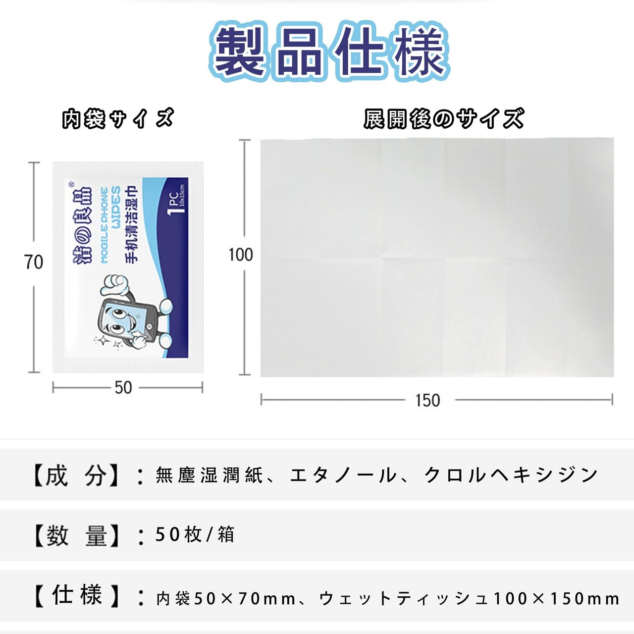 ウェットティッシュクリーナー 液晶画面用 クリーニングウェットティッシュ スマホ タブレット パソコン用 個包装 速乾 拭き跡なし 除菌対応 50枚入
