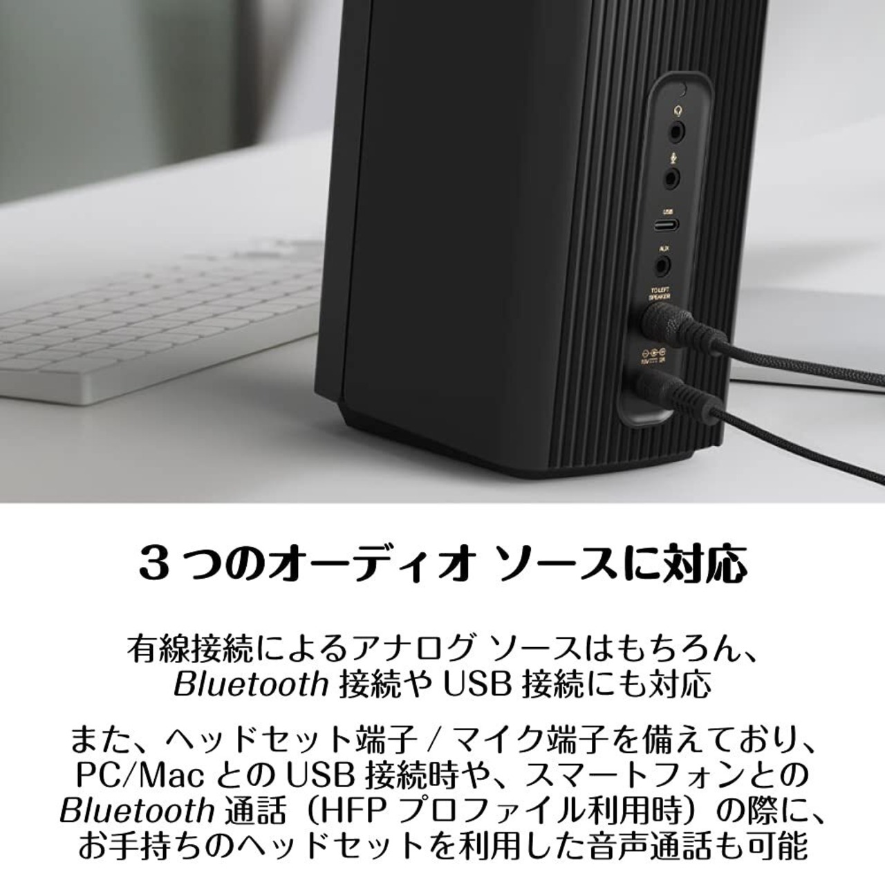 USB/Bluetooth利用時はヘッドセットやイヤホン&マイクも使え在宅ワーク等に利用可能、Windows PCとのUSB接続時はCreativeアプリのスマート コミュニケーション キットでビデオ会議の通話品質を劇的に改善、発言時だけマイクが有効になる機能や、自分側&相手側 双方のノイズを低減する機能で、オンライン コミュニケーションの音声を改善