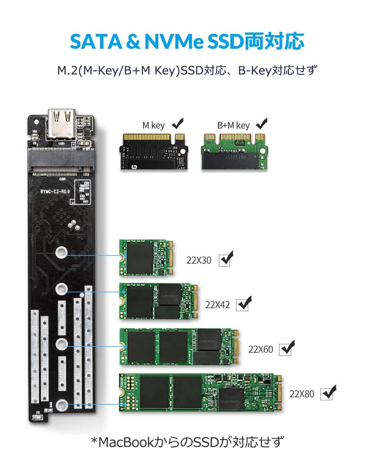 【対応機種】M.2 SSD 外付けケースは、22x30 / 22x42 / 22x60 / 22x80mmサイズのM.2 NVMeとSATA仕様のSSDに対応します。M-Key / B+M KeyのSSDがどちらも対応します。二つタイプのケーブルを付属しています、スマホとパソコンが両対応します。ご注意:B-Key SSDが対応せず。