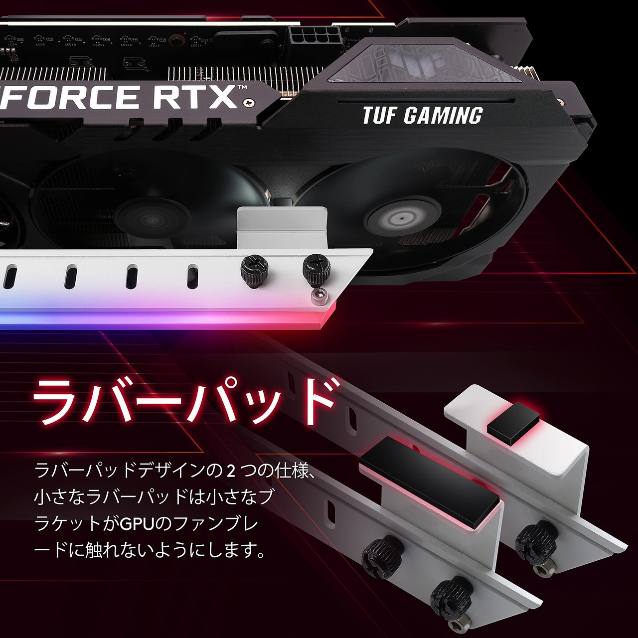 【強靭なアルミ合金製・高耐久構造】軽量かつ頑丈なアルミニウム合金を採用し、長期間の使用でもグラフィックボードをしっかり支える高耐久仕様。安定性と高級感を兼ね備えたグラボ支え。