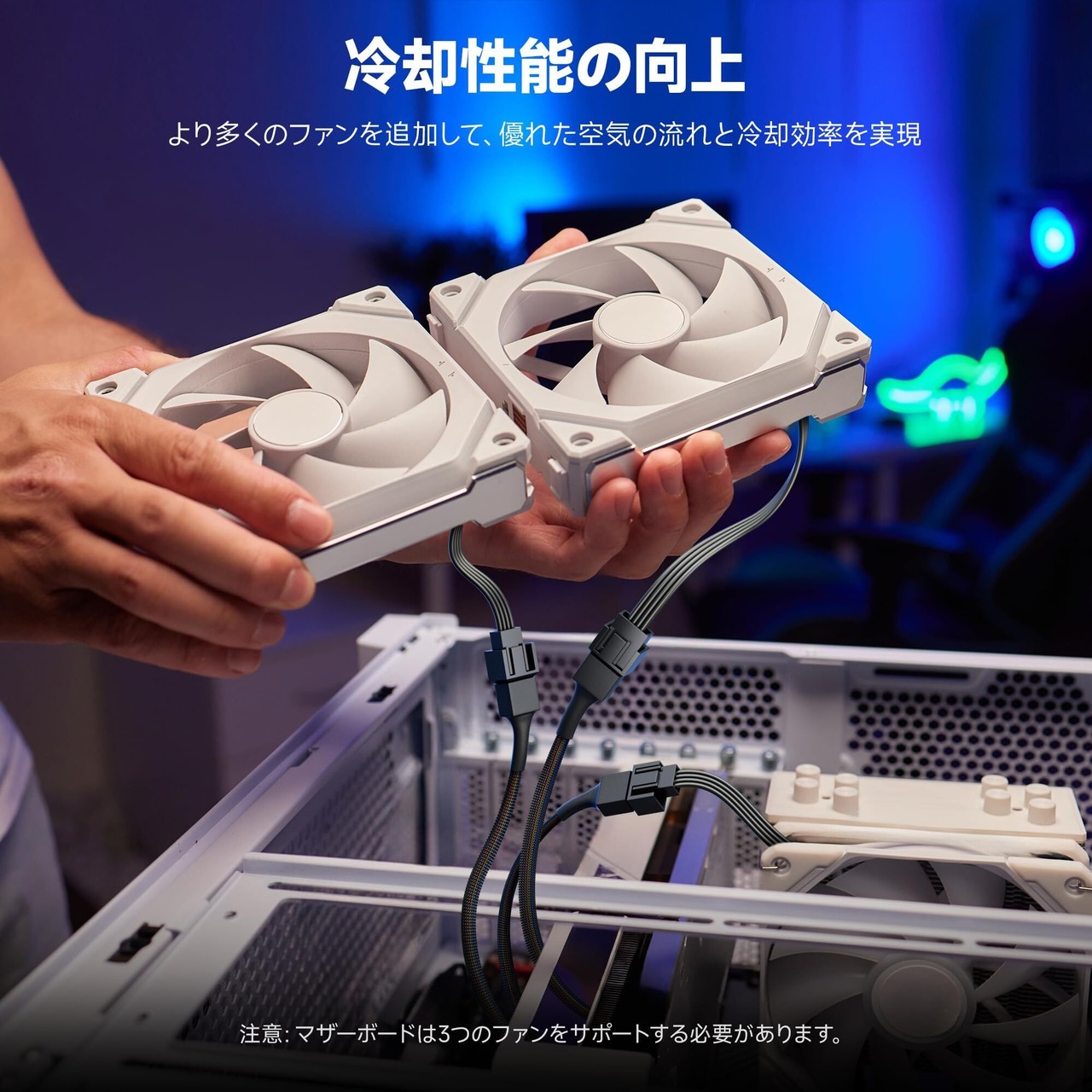 【最大6台のPWMファンと接続可能】マザーボード 4ピンレセプタクルはマザーボードの4ピンヘッダーに接続し、信号を3台のPWMファンに転送可能です。ファンは、PWM制御を備えたマザーボードのソフトウェアを使用して同じ速度で回転できます。2本セットのPWMファン用3分岐ケーブルは最大6台のPWMファンと接続でき、多数のファンを使用する方におすすめします。
