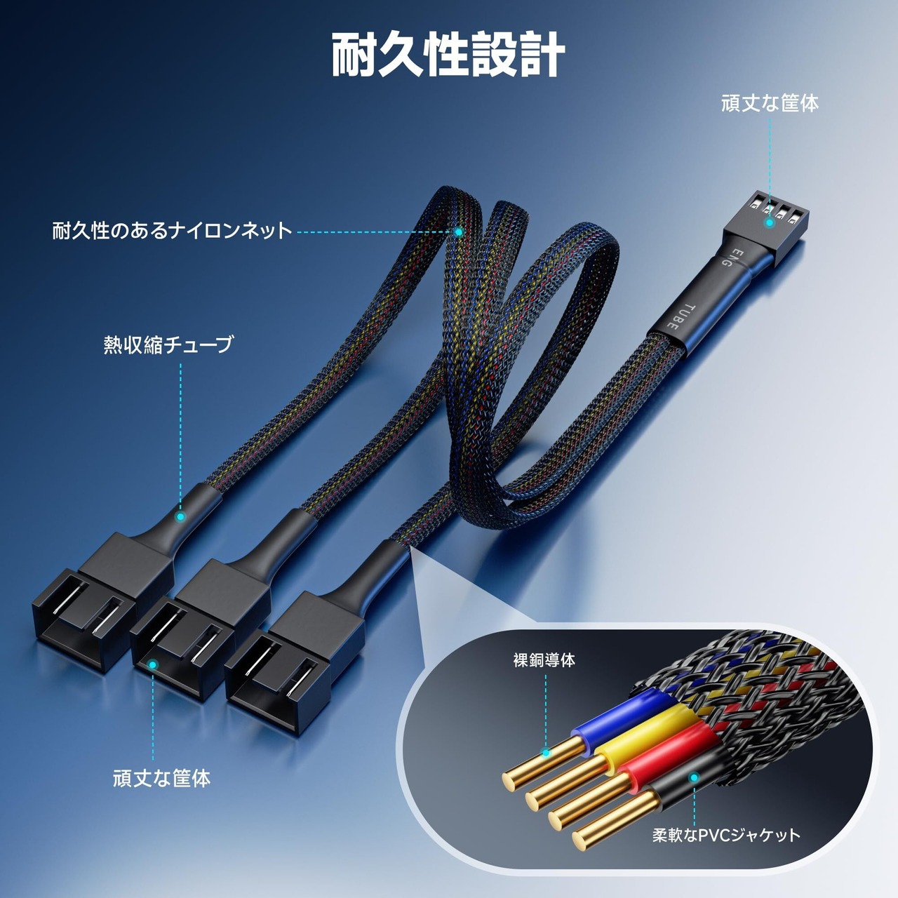 【PWMファン用3分岐ケーブル】PWMファンスプリッタケーブルにて3台のパソコンケースファンを1台のマザーボードファンヘッダーに接続可能です。3分岐ケーブルなので、3台のパソコンケースファンを追加して、空気の流通を改善でき、パソコンの放熱機能を最大化にします。