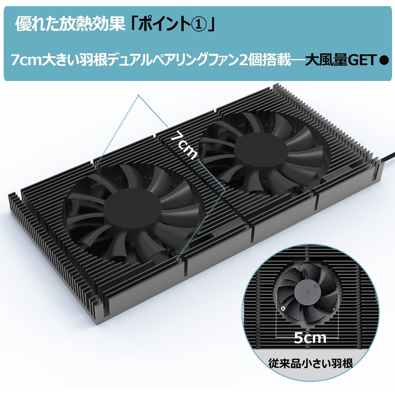 7cmファンのデザインのほうが業界の従来の5CMファンより大風量で、アルミ放熱部分の厚みは1.5cmまでアップしており、放熱効果が優れています。